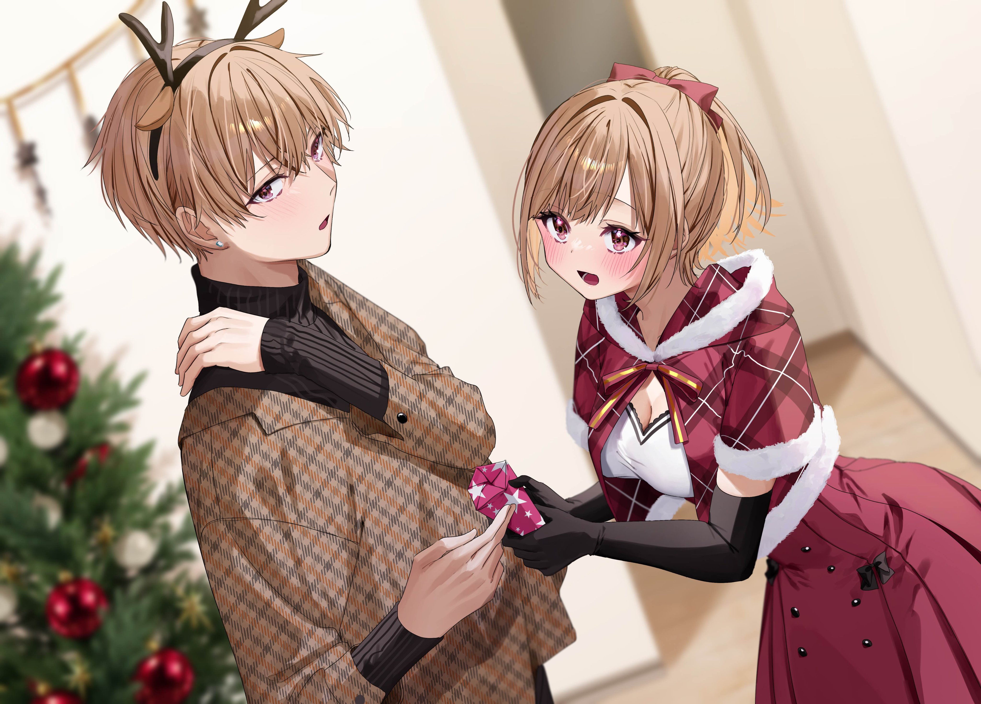 1boy 1girl absurdres antlers black_gloves blurry blurry_background blush bow breasts brown_hair chigusa_minori christmas christmas_ornaments christmas_tree cleavage commentary_request dress elbow_gloves fake_antlers gift gift_wrapping gloves hair_bow highres holding holding_gift horns indoors jitsuha_imouto_deshita. long_sleeves medium_breasts novel_illustration official_art open_mouth ponytail red_dress reindeer_antlers short_hair siblings sidelocks smile standing turtleneck ueda_hinata ueda_kousei