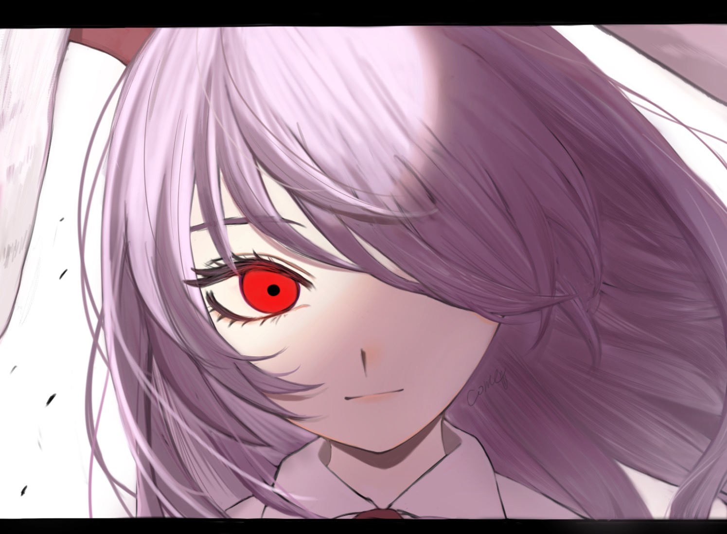 1girl animal_ears kuru_(kurukuru_koubou) looking_at_viewer one-eyed portrait purple_hair rabbit_ears red_eyes reisen_udongein_inaba signature solo touhou white_background