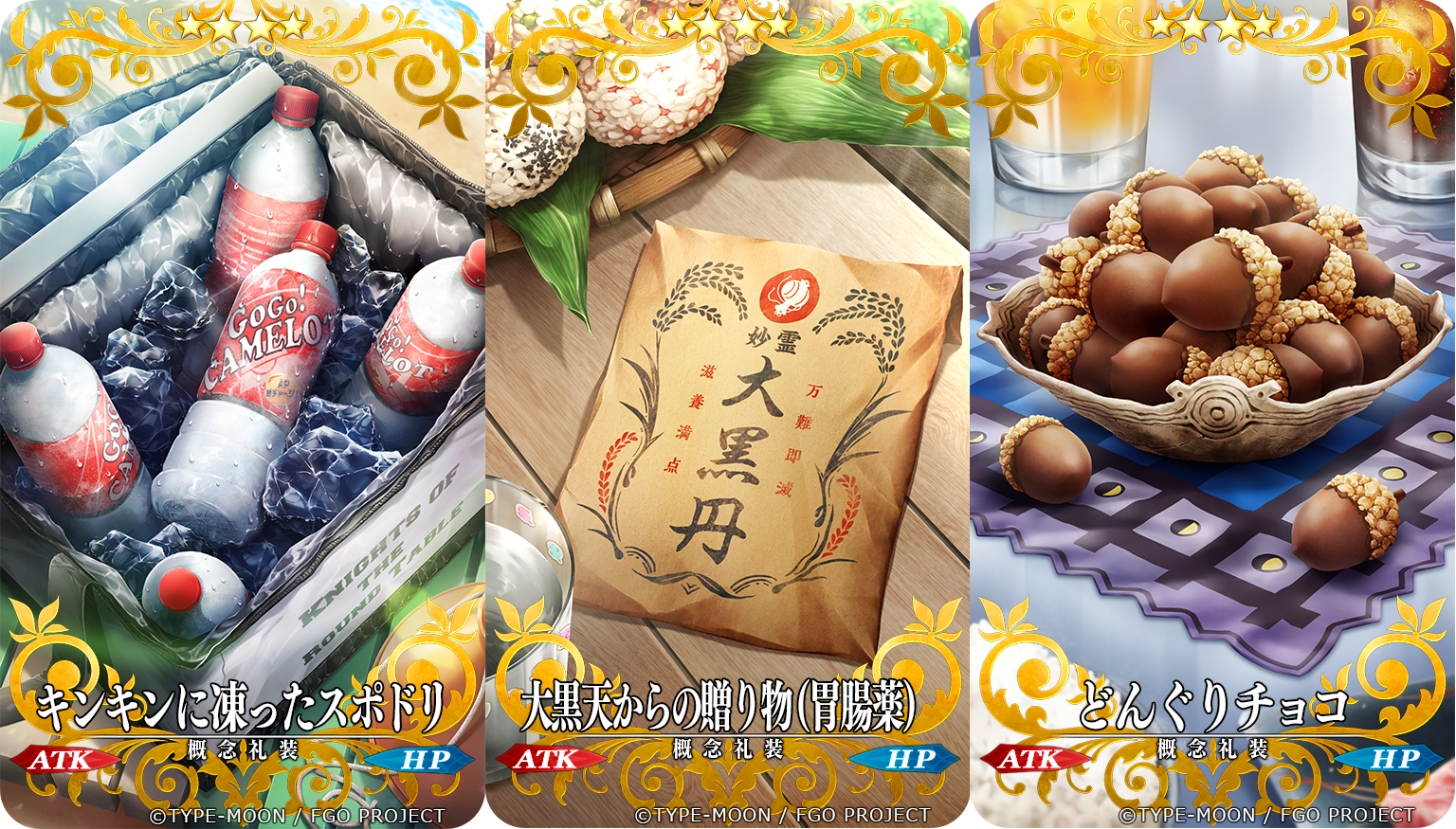 acorn bag beach_chair bottle bowl card_(medium) chocolate cooler copyright_notice craft_essence_(fate) cup drink drinking_glass fate/grand_order fate_(series) food food_art ice leaf masaki_(star8moon) no_humans official_art onigiri palm_leaf paper_bag placemat plate rice rice_bowl soda_bottle still_life sunlight table tray water wooden_table