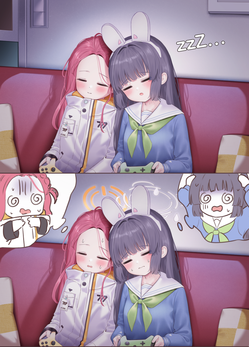 2girls @_@ animal_ears black_hair blue_archive blue_serafuku blush closed_mouth controller fake_animal_ears game_controller green_neckerchief grey_halo halo highres holding holding_controller holding_game_controller indoors ine_(ineinnen) jacket long_hair long_sleeves miyu_(blue_archive) multiple_girls neckerchief open_mouth orange_halo rabbit_ears red_hair sailor_collar school_uniform serafuku sleeping white_jacket white_sailor_collar yuzu_(blue_archive) zzz