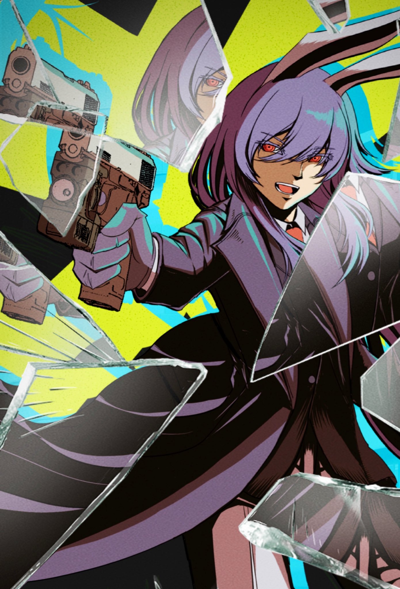 1girl broken_glass coat glass gun handgun highres holding holding_gun holding_weapon long_hair looking_at_viewer necktie open_mouth aiming red_eyes red_necktie reisen_udongein_inaba shirt solo touhou trench_coat weapon weedhollow_(dokuran)
