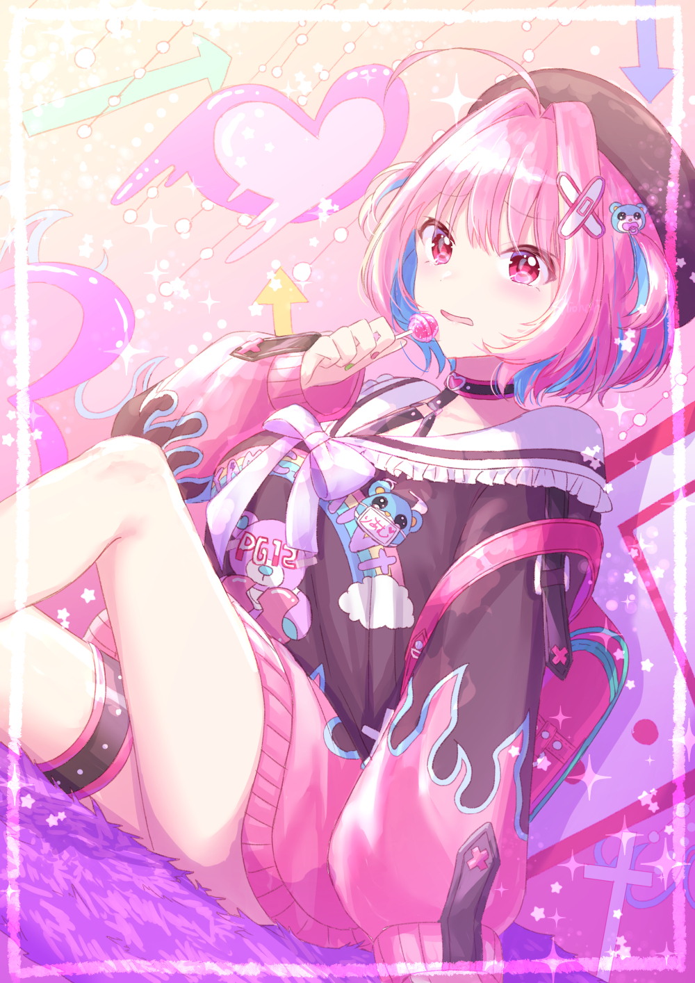 1girl ahoge animal_hair_ornament arm_support arrow_(symbol) backpack bag blue_hair blush bow bowtie breasts brown_hat candy character_name collarbone dutch_angle food from_side gradient_background hair_intakes hair_ornament hand_up hat heart highres holding holding_candy holding_food holding_lollipop idolmaster idolmaster_cinderella_girls idolmaster_cinderella_girls_starlight_stage jacket knee_up large_breasts lollipop long_sleeves looking_at_viewer multicolored_hair multicolored_jacket multicolored_nails nail_polish name_tag open_mouth pink_eyes pink_hair purple_bow purple_bowtie randoseru sailor_collar shiohari_kanna short_hair sitting solo sparkle strap_slip thigh_strap two-tone_choker two-tone_hair two-tone_jacket white_sailor_collar x_hair_ornament yumemi_riamu