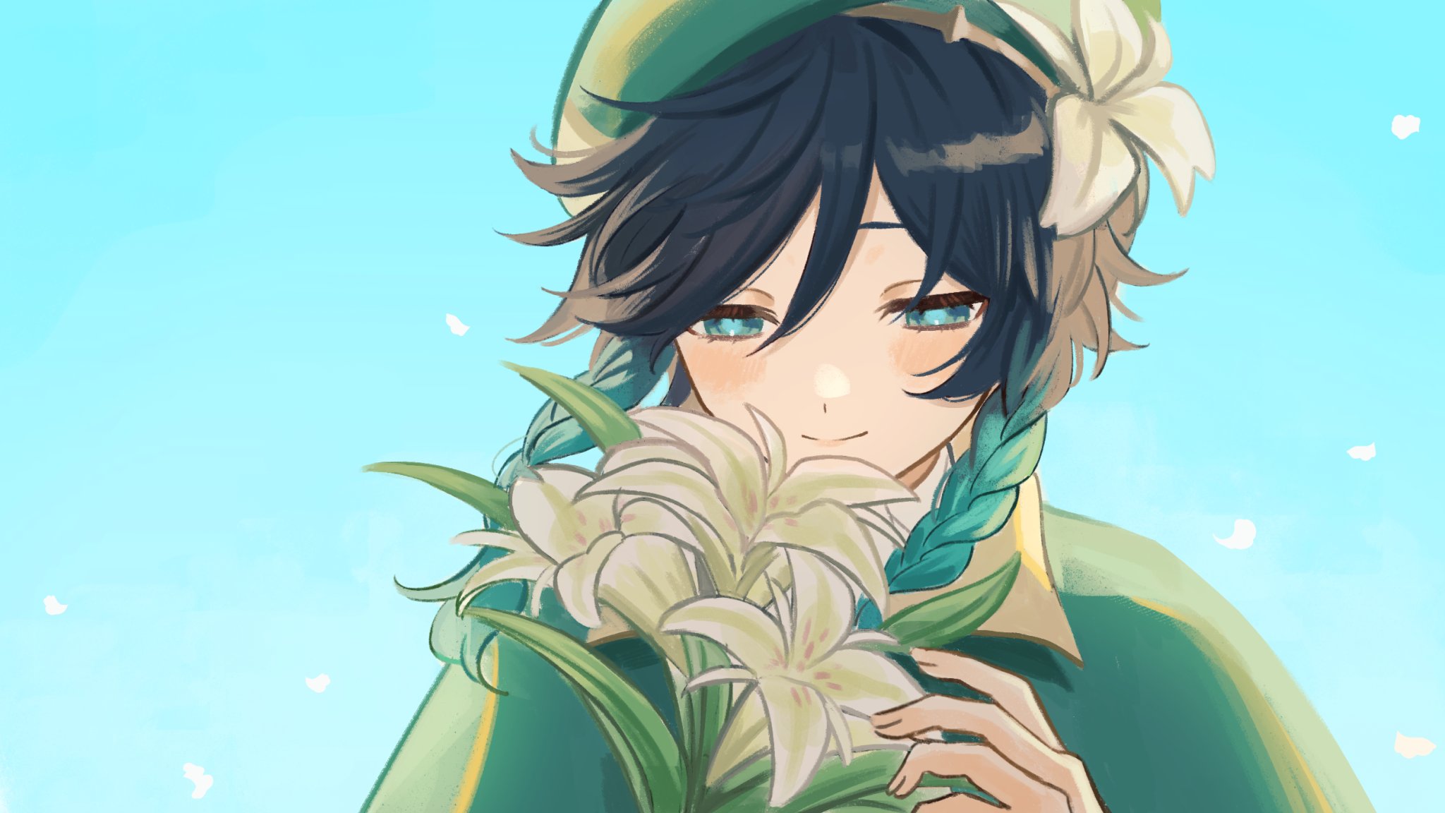 1boy 39_iduki androgynous aqua_hair beret black_hair blue_eyes braid cape closed_mouth flower genshin_impact gradient_hair green_cape green_hat hair_between_eyes half-closed_eyes hat hat_flower highres male_focus multicolored_hair petals solo twin_braids upper_body venti_(genshin_impact) white_flower