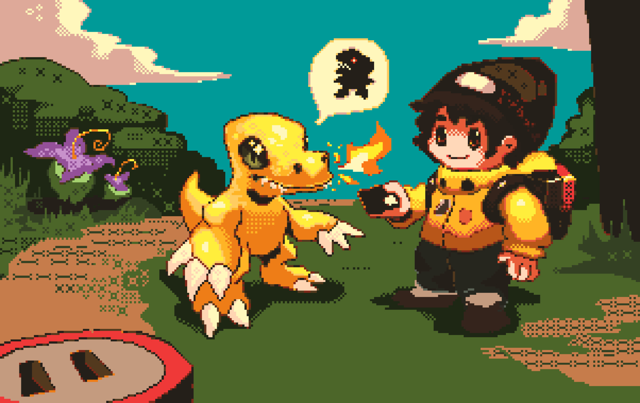 agumon alraumon backpack bag brown_hair claws digimon digimon_(creature) digimon_world fire green_eyes hat highres looking_at_another mameo_(digimon)