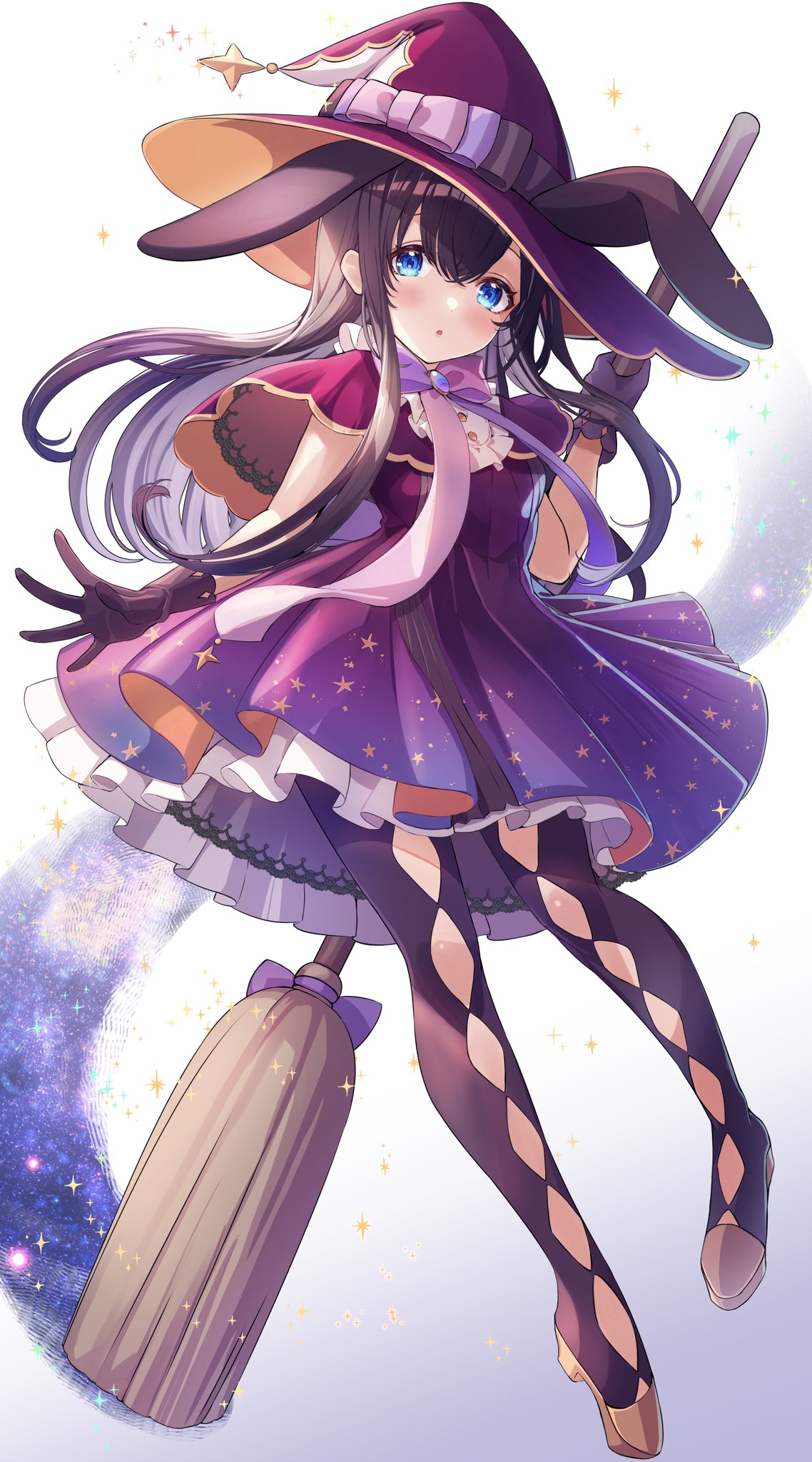 1girl :o animal_ears aoto_neko black_hair blue_eyes blush bow broom capelet diamond_cutout dress full_body gloves halloween halloween_costume hat high_heels highres holding holding_broom long_hair original pantyhose_cutout print_dress purple_bow purple_dress purple_gloves red_capelet solo sparkle star_(symbol) star_print witch_hat