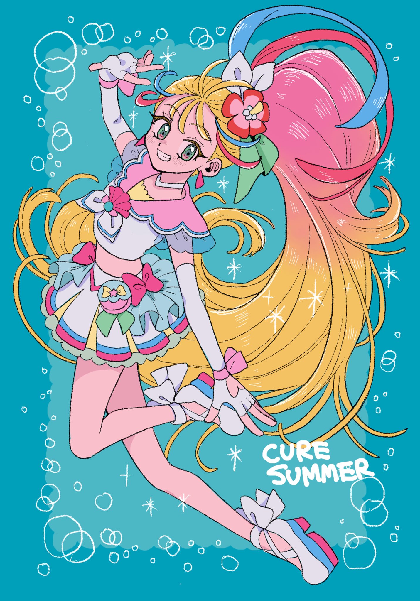 1girl ankle_bow ankle_ribbon blonde_hair blue_background bow brooch bubble choker commentary_request cure_summer earrings elbow_gloves fingerless_gloves flower frills glove_bow gloves hair_flower hair_ornament highres jewelry leg_ribbon long_hair magical_girl melon_hamburg_bentou midriff multicolored_hair natsuumi_manatsu pink_hair precure ribbon shell_brooch side_ponytail simple_background skirt smile solo triangle_earrings tropical-rouge!_precure white_choker white_gloves wrist_bow