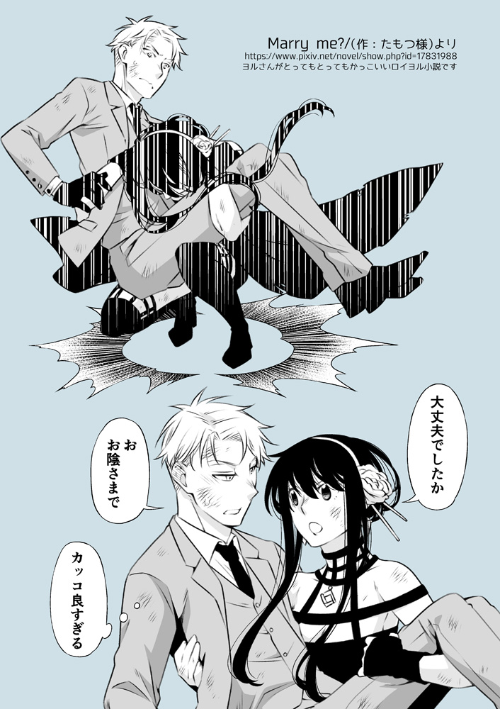 1boy 1girl breasts carrying commentary_request dirty dirty_clothes dirty_face formal_clothes gloves greyscale greyscale_with_colored_background hairband kamimiya landing large_breasts monochrome necktie princess_carry sidelocks speech_bubble spy_x_family suit thighhighs thought_bubble translation_request twilight_(spy_x_family) vest yor_briar