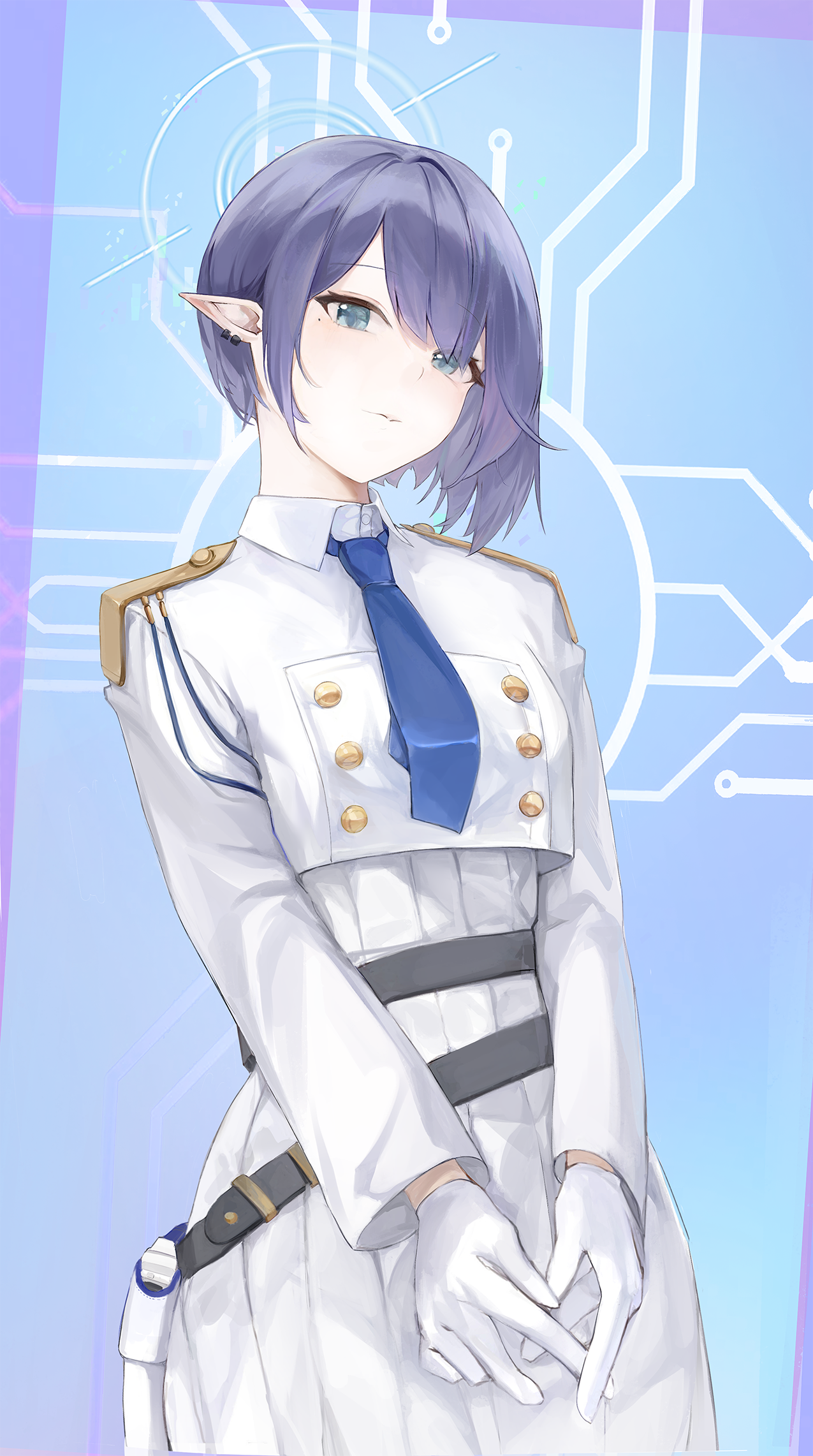 1girl aoi_(blue_archive) belt black_belt blue_archive blue_hair blue_halo blue_necktie closed_mouth collared_jacket commentary cowboy_shot cropped_jacket dress earrings epaulettes gloves green_eyes halo highres jacket jewelry kapo long_sleeves looking_at_viewer mole mole_under_eye necktie pointy_ears short_hair solo untranslatable_commentary white_dress white_gloves white_uniform