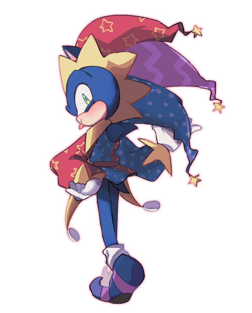 1boy animal_ears from_behind full_body furry furry_male gloves green_eyes hat highres jester jester_cap looking_at_viewer looking_back male_focus mo0n_friend multicolored_shirt official_alternate_costume pointy_shoes shoes simple_background solo sonic_(series) sonic_channel sonic_the_hedgehog sonic_the_hedgehog_(jester) standing tail tongue tongue_out white_background white_gloves