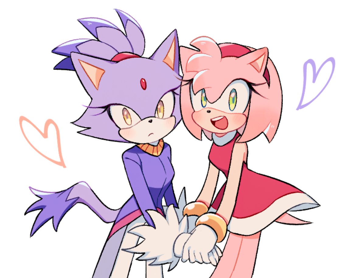 2girls amy_rose animal_ears animal_nose blaze_the_cat blush cat_ears cat_girl cat_tail closed_mouth dress forehead_jewel fur-trimmed_gloves fur_trim furry furry_female gloves green_eyes hairband heart holding_hands looking_at_viewer mo0n_friend multiple_girls open_mouth pants ponytail purple_fur red_dress red_hairband simple_background smile sonic_(series) standing tail white_background white_gloves white_pants yellow_eyes