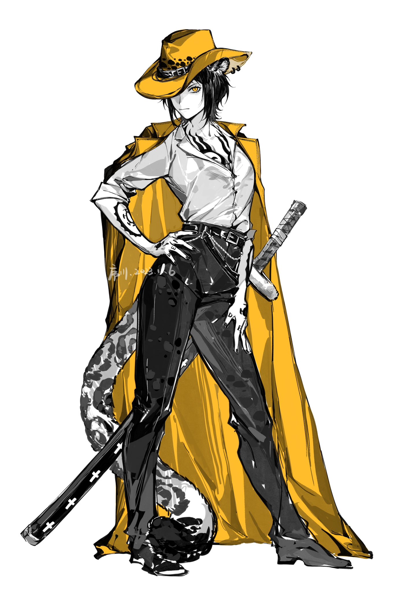 1girl animal_ears arm_tattoo black_hair black_pants breast_tattoo cape coat coat_on_shoulders genderswap genderswap_(mtf) hand_on_own_hip hat_over_one_eye highres leopard_ears leopard_girl leopard_tail one_piece pants partially_colored sheath sheathed short_hair sleeves_rolled_up snow_leopard snow_leopard_ears snow_leopard_tail solo standing sword tail tattoo trafalgar_law weapon xuchuan yellow_cape yellow_eyes yellow_headwear
