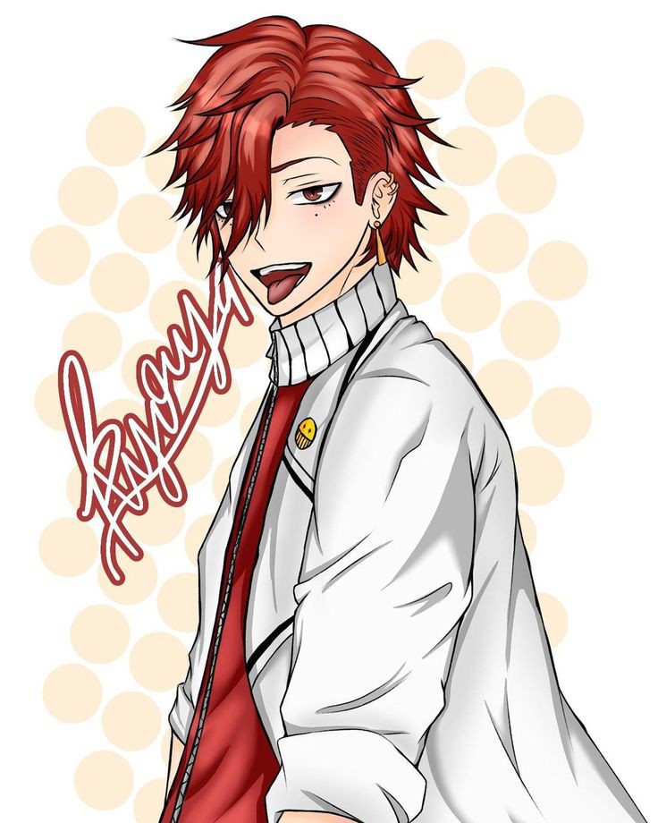 1boy oiranzaka_kyouya red_eyes red_hair red_shirt shirt simple_background smile tongue tougen_anki white_background white_shirt