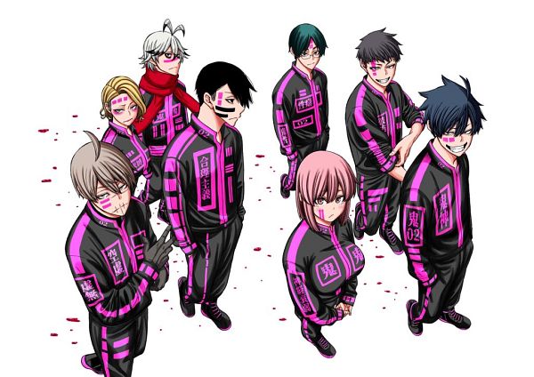 2girls 6+boys ahoge antenna_hair black_eyes black_hair blonde_hair brown_hair byobugaura_homare glasses green_hair grey_eyes ichinose_shiki_(tougen_anki) kiriyama_rokuro kougasaki_jin long_hair mudano_naito multiple_boys multiple_girls pink_eyes pink_hair sazanami_kuina serious short_hair simple_background smile tougen_anki very_long_hair white_background white_hair yaoroshi_ikari yellow_eyes yusurube_jyuuji