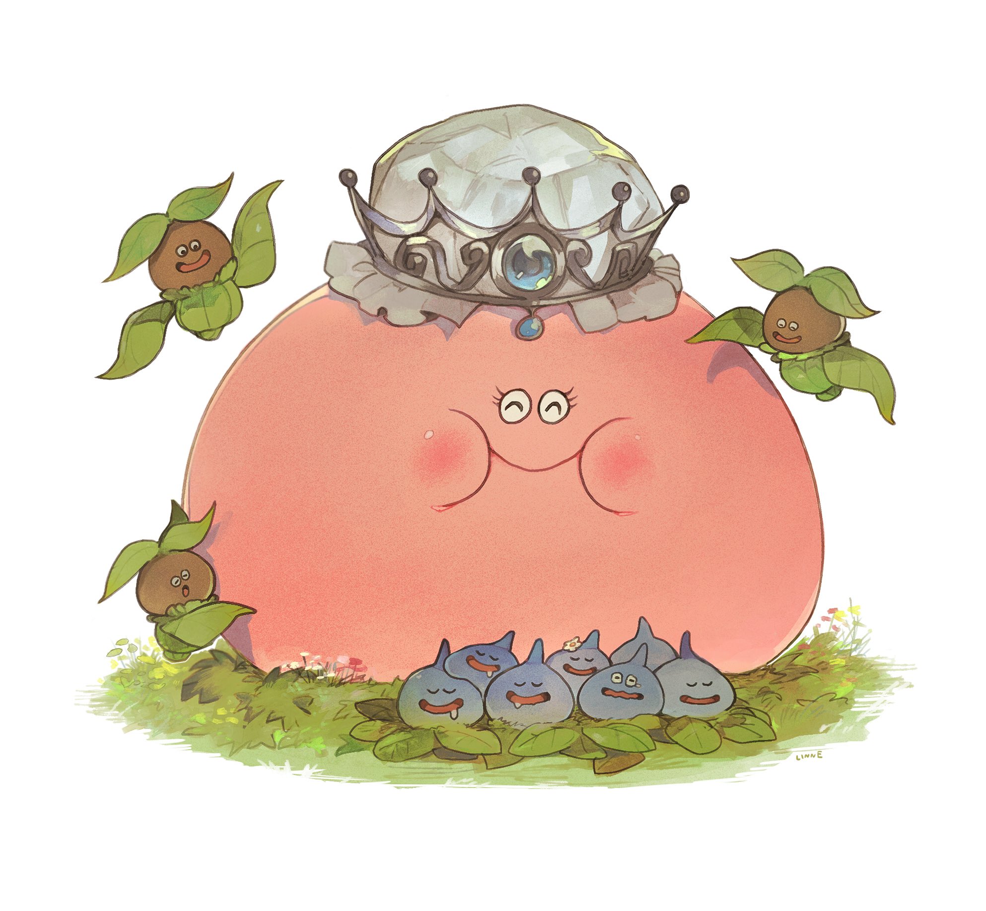 :i :o artist_name blue_gem blush closed_eyes closed_mouth commentary_request crown dragon_quest drooling eyelashes flower flying fright_bulb gem grass highres leaf linne_(hld_doreko) monster monster_focus no_humans open_mouth queen_slime_(dragon_quest) simple_background sleeping slime_(creature) slime_(dragon_quest) smile u_u wavy_mouth white_background white_flower