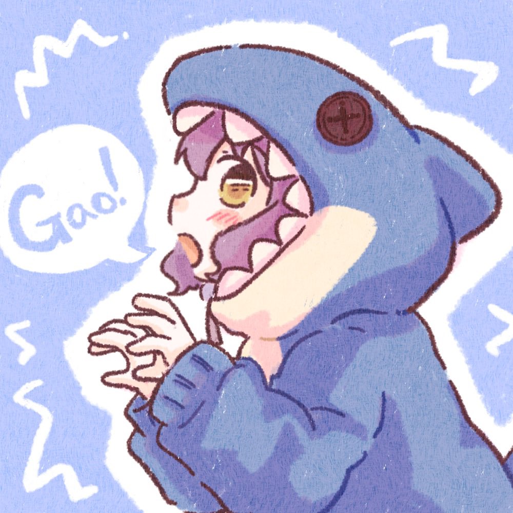 1girl 77haniwa animal_costume animal_hood blue_background blue_pajamas blush button_eyes buttons claw_pose commentary hood idolmaster idolmaster_million_live! long_sleeves makabe_mizuki open_mouth pajamas profile purple_hair shark_costume shark_hood short_hair sidelocks sideways_glance solo speech_bubble upper_body wavy_hair yellow_eyes
