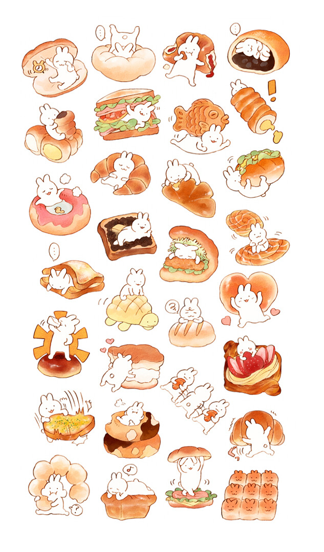 ! ... :3 ? animal_focus steamed_bun black_eyes bottle bun_(food) chewing closed_mouth commentary donut drinking eating food food_focus from_behind h_kawa hand_on_own_stomach heart holding holding_bottle holding_food lying milk motion_lines musical_note no_humans on_stomach open_mouth original oversized_food oversized_object rabbit rubbing_eyes sandwich simple_background sitting smile solid_circle_eyes speech_bubble spoken_musical_note spoken_question_mark spoken_squiggle squiggle taiyaki wagashi white_background