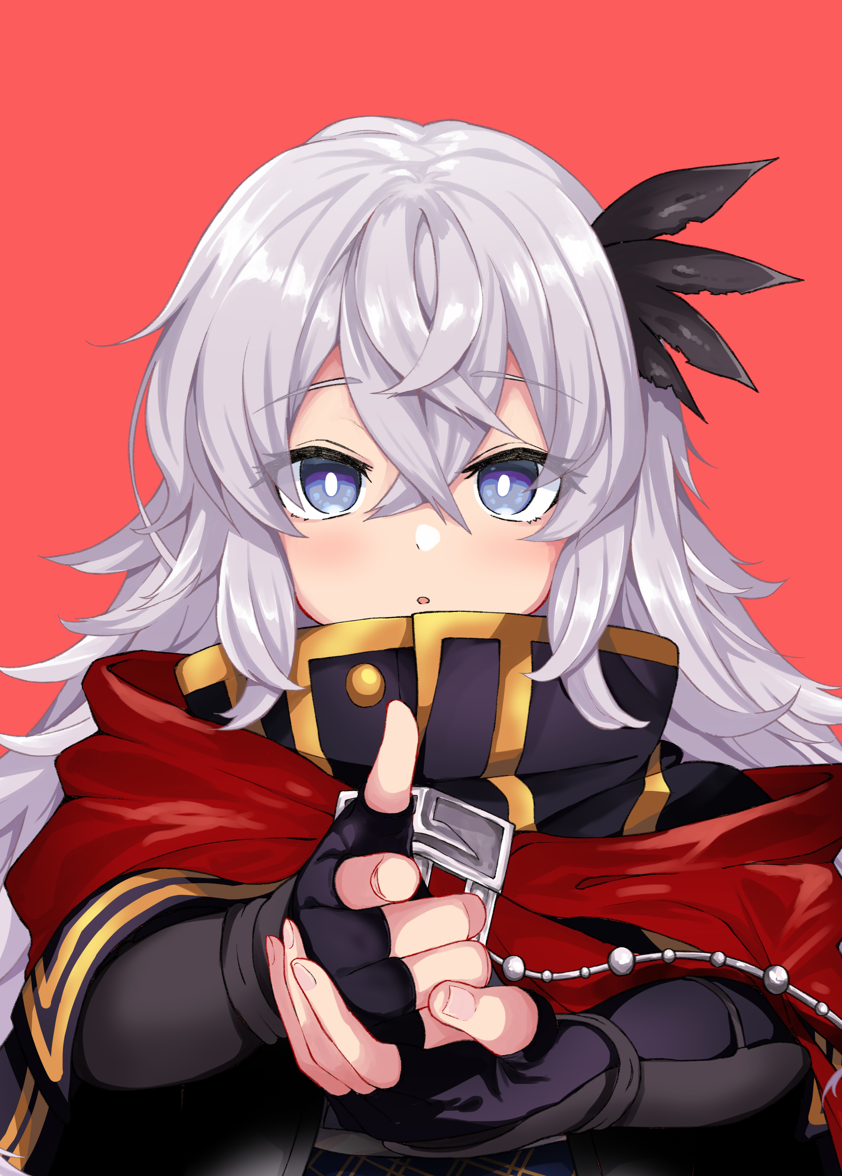 1girl absurdres blue_eyes bright_pupils cape fate/grand_order fate_(series) feather_hair_ornament feathers finger_gun fingerless_gloves gloves grey_hair hair_ornament highres long_hair red_background red_cape saika_magoichi_(fate) tanuki_(siutkm0228) white_pupils
