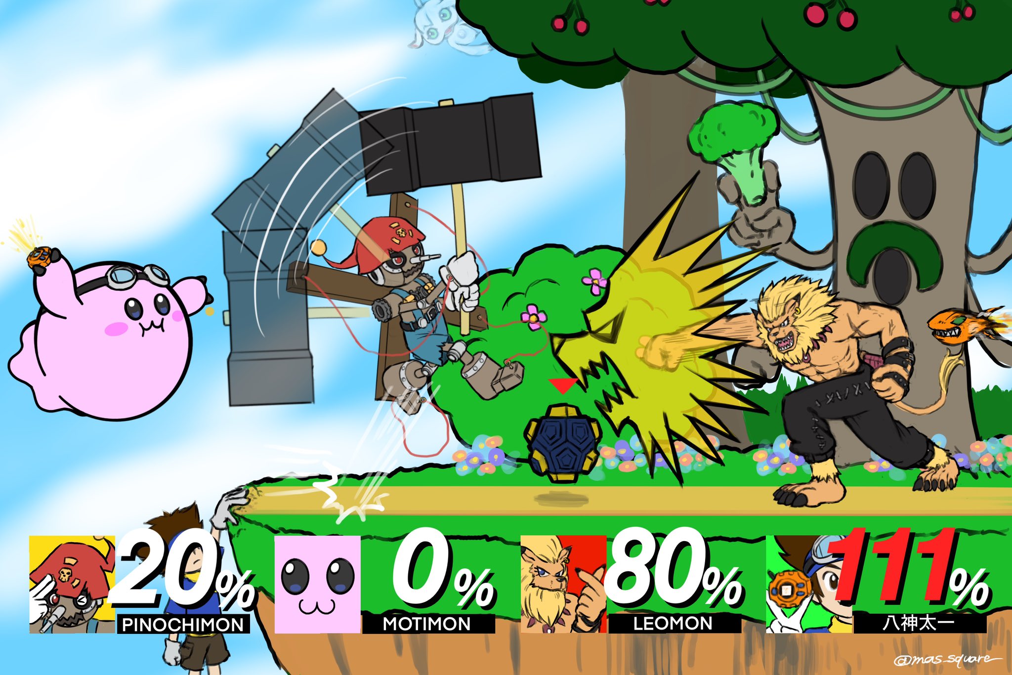 :3 apocalymon broccoli digimon digimon_(creature) digivice facial_hair fake_screenshot fighting forest full_body grass hammer highres holding holding_weapon jumping jyureimon kirby_(series) leomon looking_at_another mario_(series) mas_square mochimon multiple_boys muscular mustache nature nintendo parody pinochimon sky super_mario_bros._1 trait_connection tree weapon yagami_taichi
