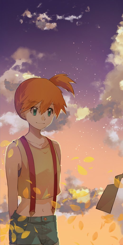 1girl abs asymmetrical_hair blue_shorts blush breasts denim denim_shorts gen_1_pokemon green_eyes hair_tie holding holding_pokemon legs misty_(pokemon) nintendo orange_hair pikachu pokemon pokemon_(anime) pokemon_(creature) pokemon_the_series:_sun_&_moon ponytail shia_(kashia) shorts side_ponytail sleeveless small_breasts smile suspender_shorts suspenders thighs