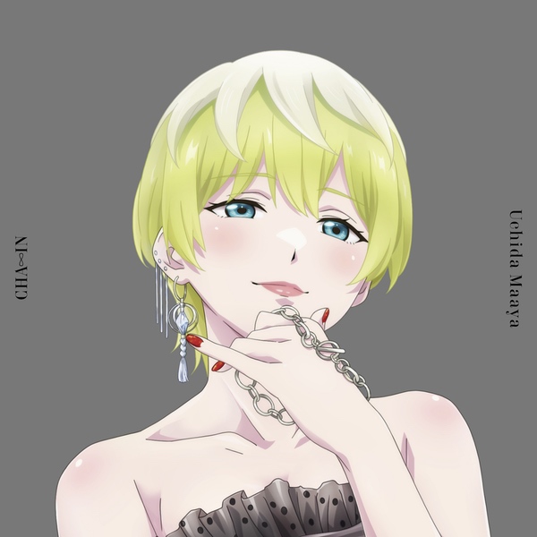 album_cover bare_arms bare_shoulders blue_eyes blush close-up cover earrings english_text green_hair izumo_tenka jewelry looking_at_viewer mato_seihei_no_slave official_art red_nails short_hair uchida_maaya