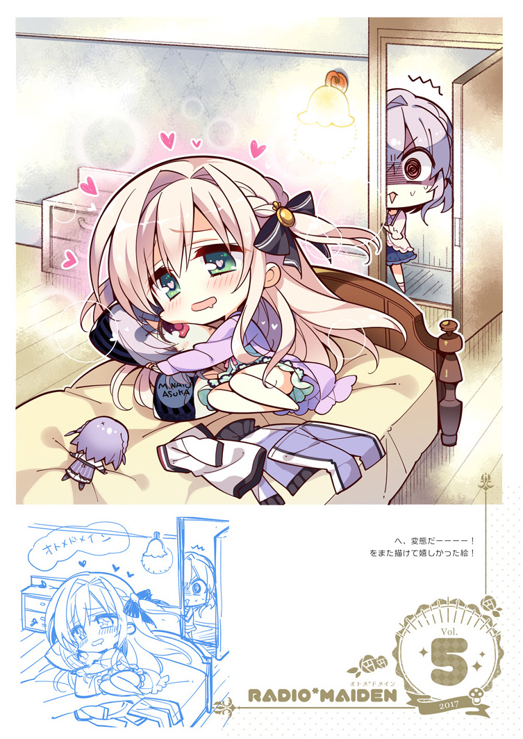 1boy 1girl @_@ ^^^ asuka_minato bare_legs black_bow blue_hair blush bow braid cardigan casual character_doll character_name character_print chibi comiket_103 commentary_request dakimakura_(object) doll dress drooling green_dress green_eyes hair_between_eyes hair_bow hair_intakes heart heart-shaped_pupils hetero hug hugging_object indoors komowata_haruka light_brown_hair long_hair looking_at_another lovestruck medium_hair mouth_drool official_art on_bed open_door open_mouth otome_domain peeking pillow purple_cardigan red_eyes saionji_kazari side_braid sidelocks sitting smile standing surprised sweatdrop symbol-shaped_pupils translation_request trap two_side_up very_long_hair walk-in wide-eyed yokozuwari