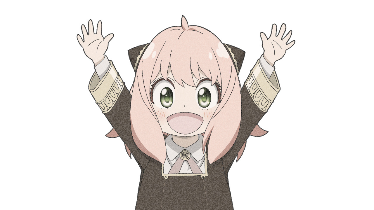 1girl :d anya_(spy_x_family) arms_up black_dress child dress eden_academy_school_uniform green_eyes hairpods medium_hair open_mouth pink_hair school_uniform simple_background smile solo spy_x_family watanabegenn white_background