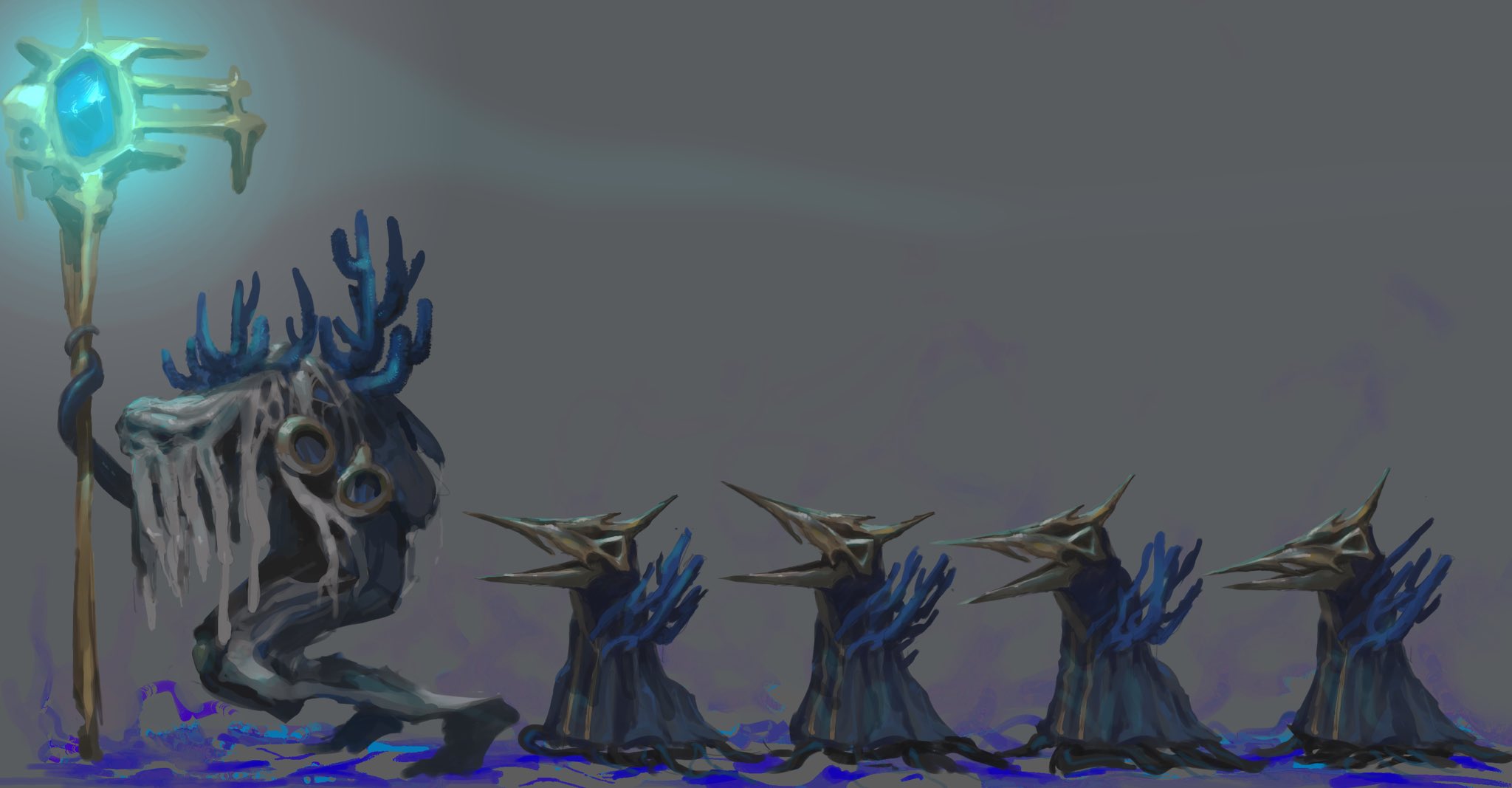 arknights beak coral eldritch_abomination feet glowing_staff grey_background highres holding holding_staff monster monster_focus mutomorokoshi nethersea_brandguider_(arknights) nethersea_predator_(arknights) seaborn_(arknights) simple_background staff tentacles
