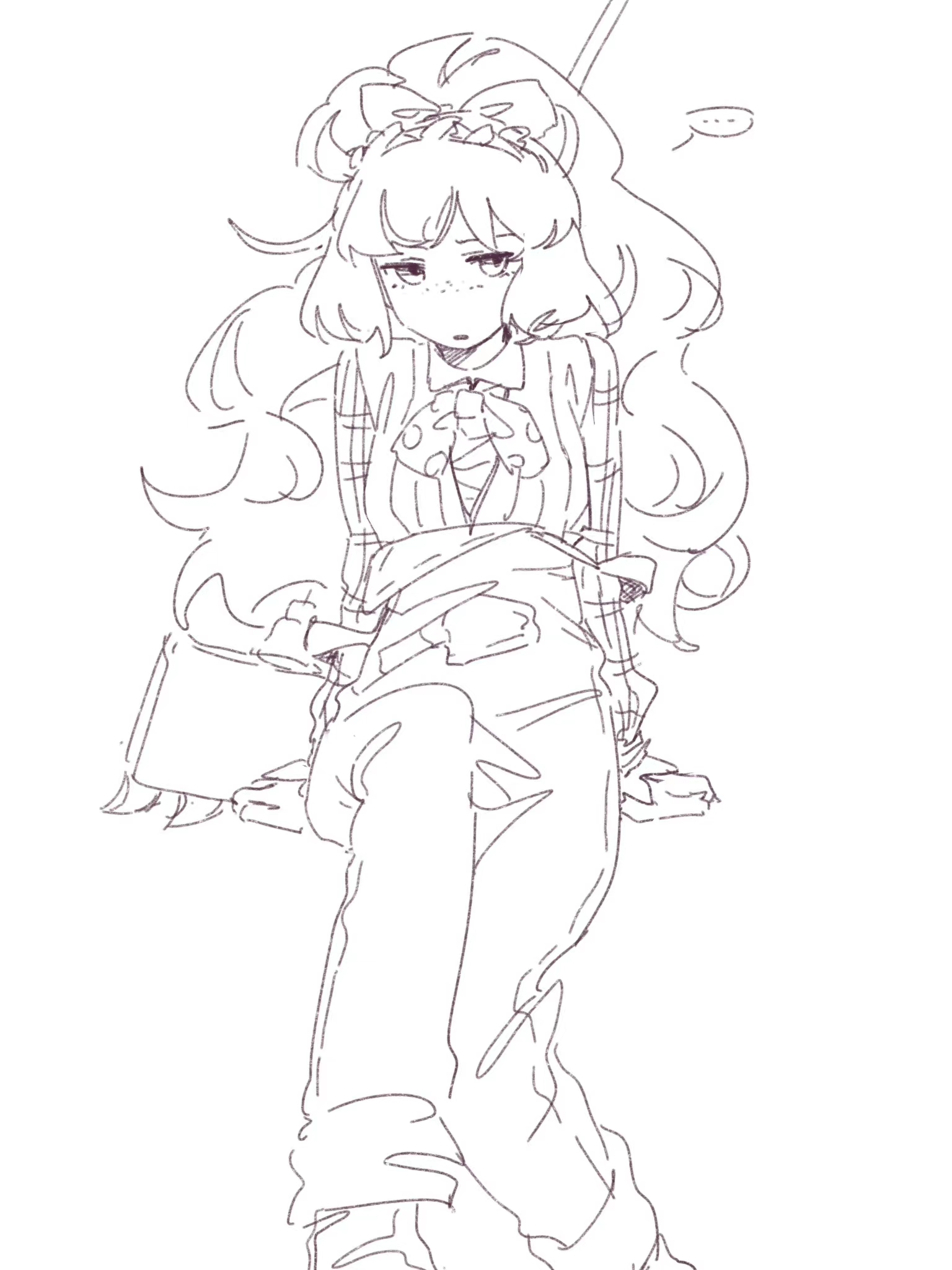 1girl bow bowtie e.g.o_(project_moon) greyscale hair_bow high_ponytail highres ishmael_(project_moon) ivy_(675671) limbus_company looking_at_viewer monochrome oekaki overalls pants parted_lips polka_dot_bow polka_dot_bowtie ponytail project_moon scarecrow_searching_for_wisdom shirt simple_background sitting solo
