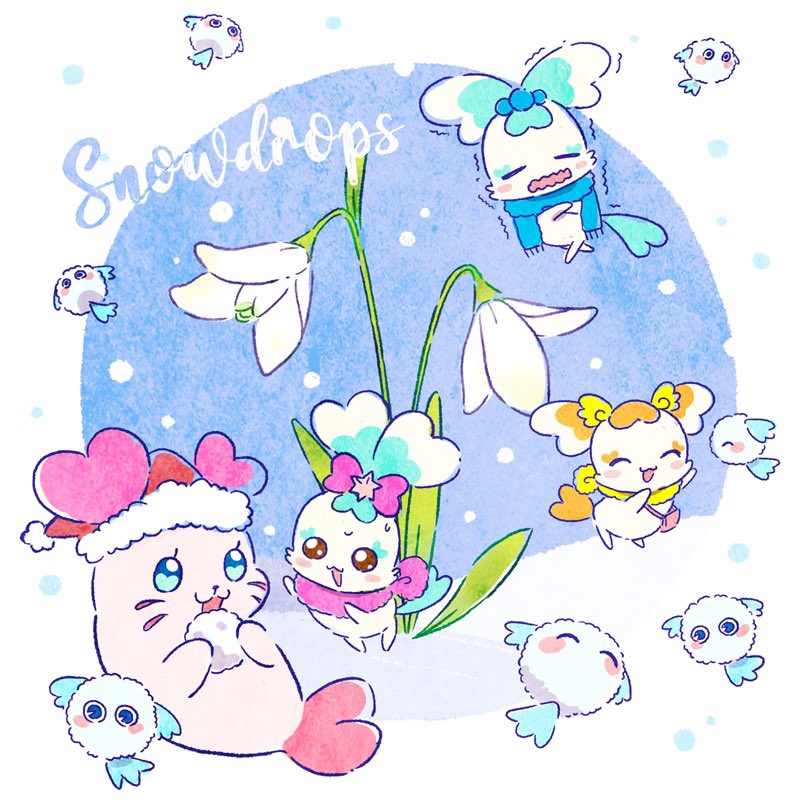bow chypre_(precure) coffret_(precure) creature english_text flower hat heartcatch_precure! holding holding_snowball hoppetoonaka3 in-franchise_crossover kururun_(precure) no_humans potpourri_(precure) precure santa_hat scarf seal_(animal) simple_background snow snowball snowing tropical-rouge!_precure