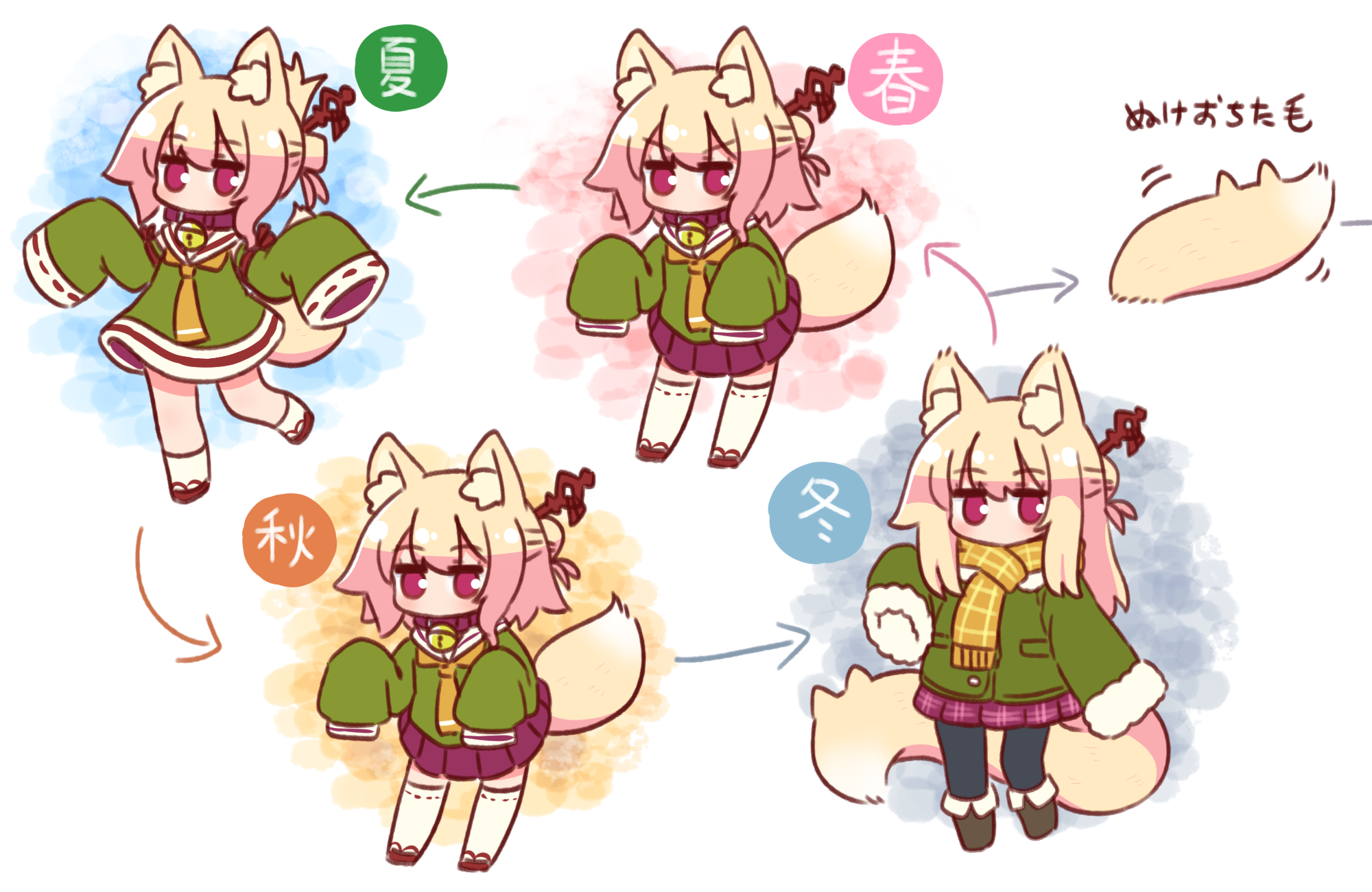 1girl animal_ear_fluff animal_ears arrow_(symbol) bell black_footwear black_pantyhose boots brown_collar brown_scarf collar commentary_request dress folded_ponytail fox_ears fox_girl fox_tail fringe_trim fur-trimmed_jacket fur-trimmed_sleeves fur_trim green_dress green_jacket green_shirt hair_between_eyes hair_bun hair_ornament highres jacket jingle_bell kemomimi-chan_(naga_u) long_sleeves naga_u neck_bell necktie orange_necktie original pantyhose plaid_clothes plaid_skirt pleated_skirt purple_eyes purple_skirt red_footwear ribbon-trimmed_legwear ribbon-trimmed_sleeves ribbon_trim sandals scarf shirt skirt sleeves_past_fingers sleeves_past_wrists socks tail thighhighs translation_request v-shaped_eyebrows white_socks white_thighhighs wide_sleeves zouri