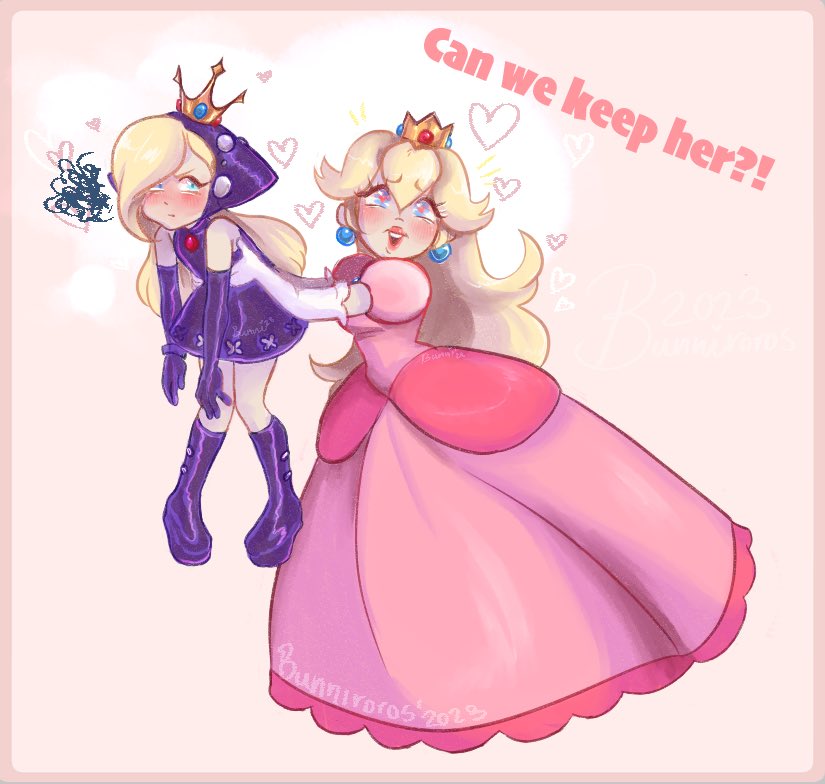 2023 2girls :t animal_ears annoyed bare_shoulders blonde_hair blue_eyes boots brooch bunniroros carrying carrying_person cat_ears crown dated dress earrings elbow_gloves gloves hair_between_eyes hair_over_one_eye heart heart-shaped_pupils height_difference jewelry knee_boots long_eyelashes long_hair looking_at_viewer mario_(series) mario_power_tennis mario_tennis mini_crown multiple_girls nintendo petite pigeon-toed pink_background pink_dress pink_lips pout princess_peach puffy_short_sleeves puffy_sleeves purple_dress purple_footwear purple_gloves short_sleeves so_moe_i'm_gonna_die! sphere_earrings squiggle straight_hair symbol-shaped_pupils warupeach wavy_hair white_gloves