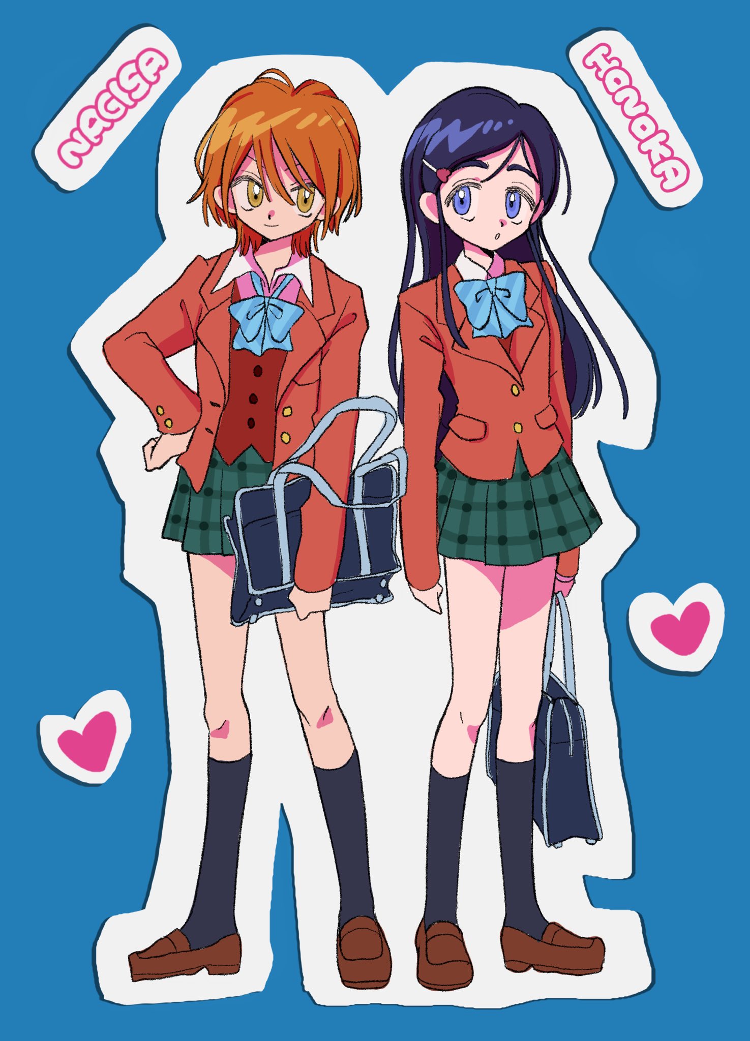 2girls bag blazer blue_bow blue_eyes bow bowtie brown_eyes brown_footwear brown_jacket commentary_request english_text futari_wa_precure heart highres holding holding_bag jacket magical_girl melon_hamburg_bentou misumi_nagisa multiple_girls orange_hair plaid_clothes plaid_skirt precure school_uniform simple_background skirt striped_bow striped_bowtie striped_clothes verone_gakuin_school_uniform yukishiro_honoka