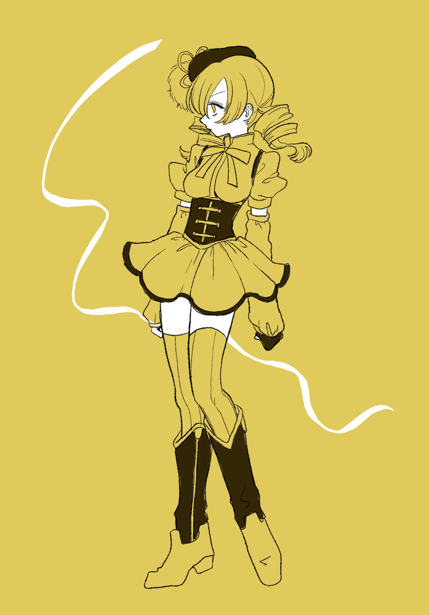 1girl beret blonde_hair breasts commentary_request corset drill_hair gloves hat highres magical_girl mahou_shoujo_madoka_magica mahou_shoujo_madoka_magica_(anime) medium_breasts melon_hamburg_bentou ribbon skirt solo striped_clothes striped_thighhighs thighhighs tomoe_mami tomoe_mami_(magical_girl) twin_drills twintails yellow_background yellow_eyes