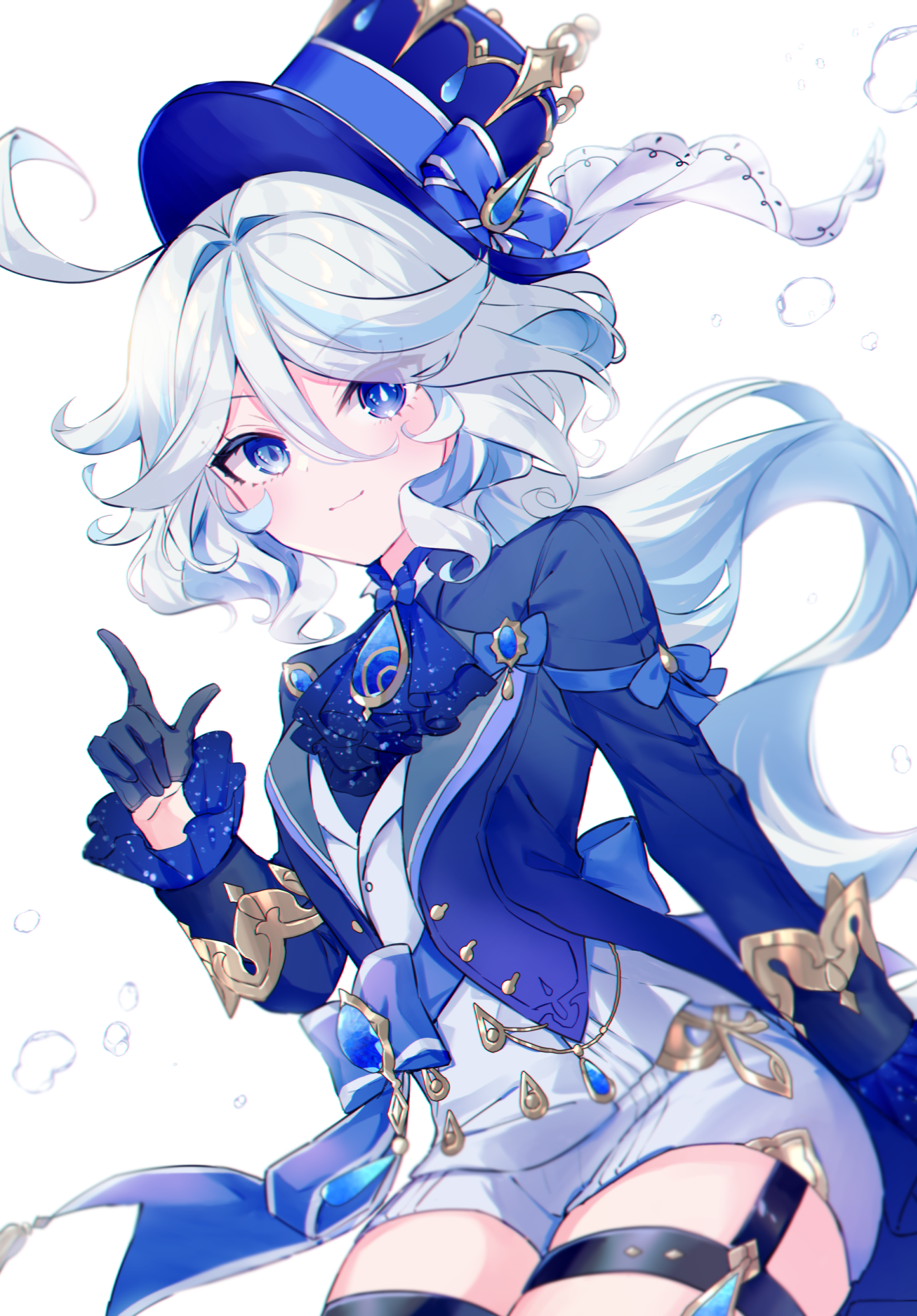 1girl ahoge ascot black_gloves blue_ascot blue_eyes blue_hair blue_hat blue_jacket brooch bubble closed_mouth cowboy_shot furina_(genshin_impact) genshin_impact gloves hair_between_eyes hat heterochromia highres jacket jewelry long_hair miyakoto multicolored_hair shorts sidelocks simple_background smile solo streaked_hair top_hat two-tone_hair white_background white_shorts