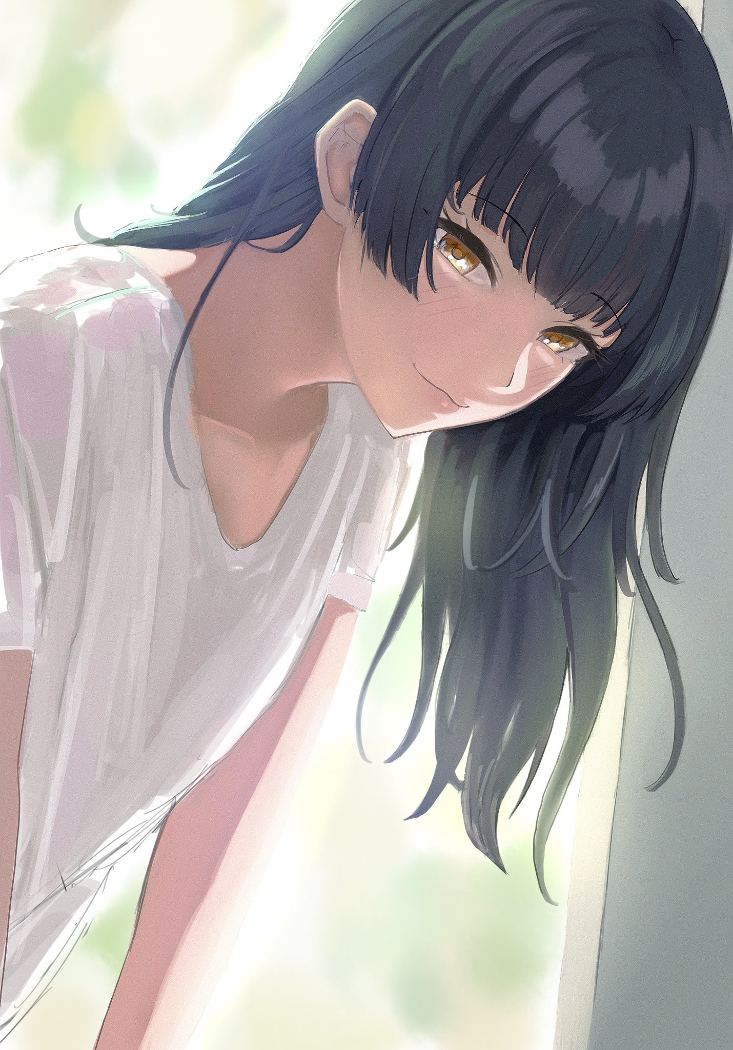 1girl black_hair blush hatorika_siso highres idolmaster idolmaster_shiny_colors leaning_forward light_smile looking_at_viewer looking_to_the_side mayuzumi_fuyuko see-through_clothes see-through_shirt shirt short_sleeves solo upper_body white_shirt