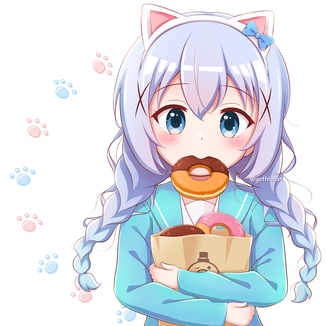1girl animal_ears bag blue_bow blue_eyes blue_hair blue_jacket blue_sailor_collar blush bow braid child commentary_request donut fake_animal_ears food food_in_mouth gochuumon_wa_usagi_desu_ka? goth_risuto hair_between_eyes hair_ornament hairband hugging_object jacket kafuu_chino long_hair long_sleeves looking_at_viewer low_twintails mouth_hold open_clothes open_jacket paper_bag sailor_collar shirt simple_background solo twin_braids twintails twitter_username upper_body white_background white_hairband white_shirt x_hair_ornament