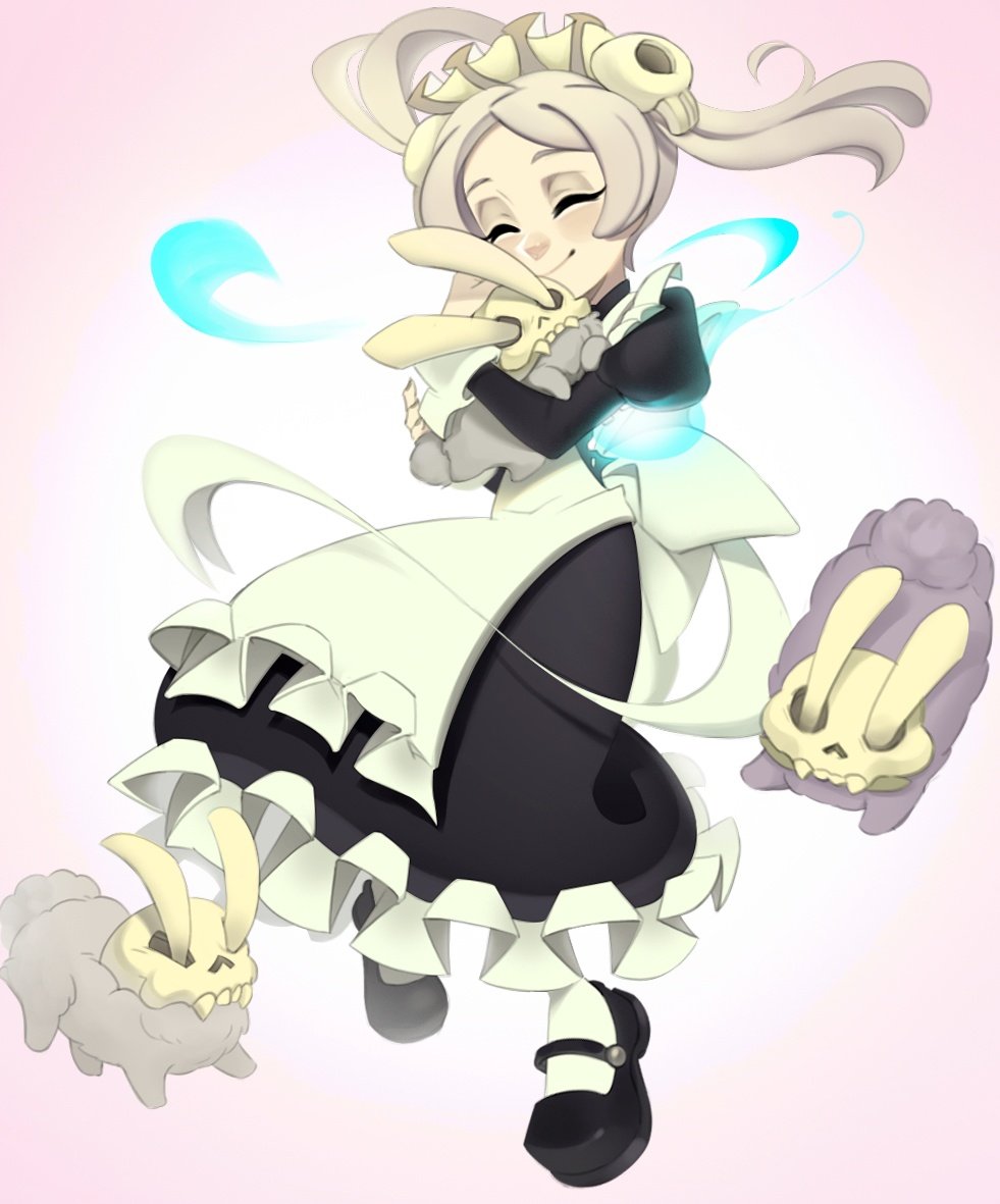 1girl apron bloody_marie_(skullgirls) blush brooch closed_eyes dress dust_bunny_(skullgirls) frilled_apron frilled_dress frills grey_hair hair_ornament jewelry juliet_sleeves long_sleeves luxey_san maid_headdress mary_janes pantyhose pink_background puffy_sleeves shoes skull skull_hair_ornament skullgirls smile solo twintails