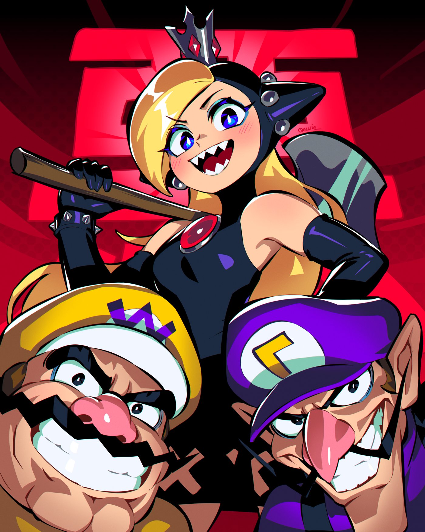 1girl 2boys axe bare_shoulders large_nose black_dress black_gloves blonde_hair blue_eyes blue_eyeshadow bracelet breasts brown_hair commentary crown dress elbow_gloves english_commentary evil_grin evil_smile eyeshadow facial_hair gem gloves grin hand_up hat highres holding holding_axe hooded_dress jewelry long_hair long_nose looking_at_viewer makeup mario_(series) mario_power_tennis mario_tennis mini_crown multiple_boys mustache nintendo open_mouth pointy_ears purple_headwear qewie red_background red_gem sharp_teeth short_hair small_breasts smile spiked_bracelet spikes standing teeth thick_eyebrows waluigi wario warupeach yellow_headwear