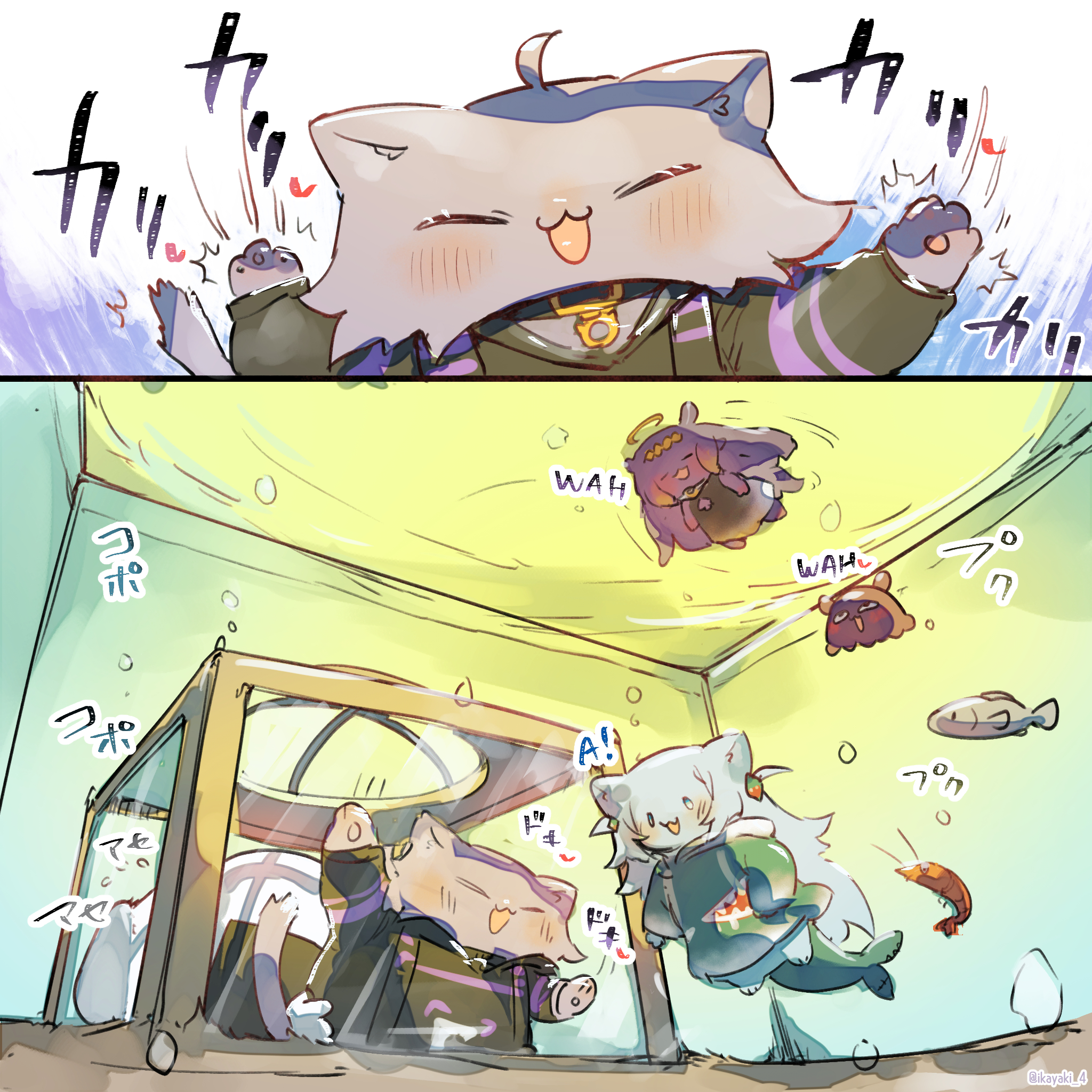 3girls animalization black_hoodie blue_hoodie blush breast_pillow cat chibi ebi-chan_(gawr_gura) gawr_gura gawr_gura_(1st_costume) highres hololive hololive_english hood hoodie ikayaki_(ikayaki4) multiple_girls nekomata_okayu nekomata_okayu_(1st_costume) nekomata_okayu_(cat) ninomae_ina'nis ninomae_ina'nis_(1st_costume) no_humans takodachi_(ninomae_ina'nis) underwater virtual_youtuber