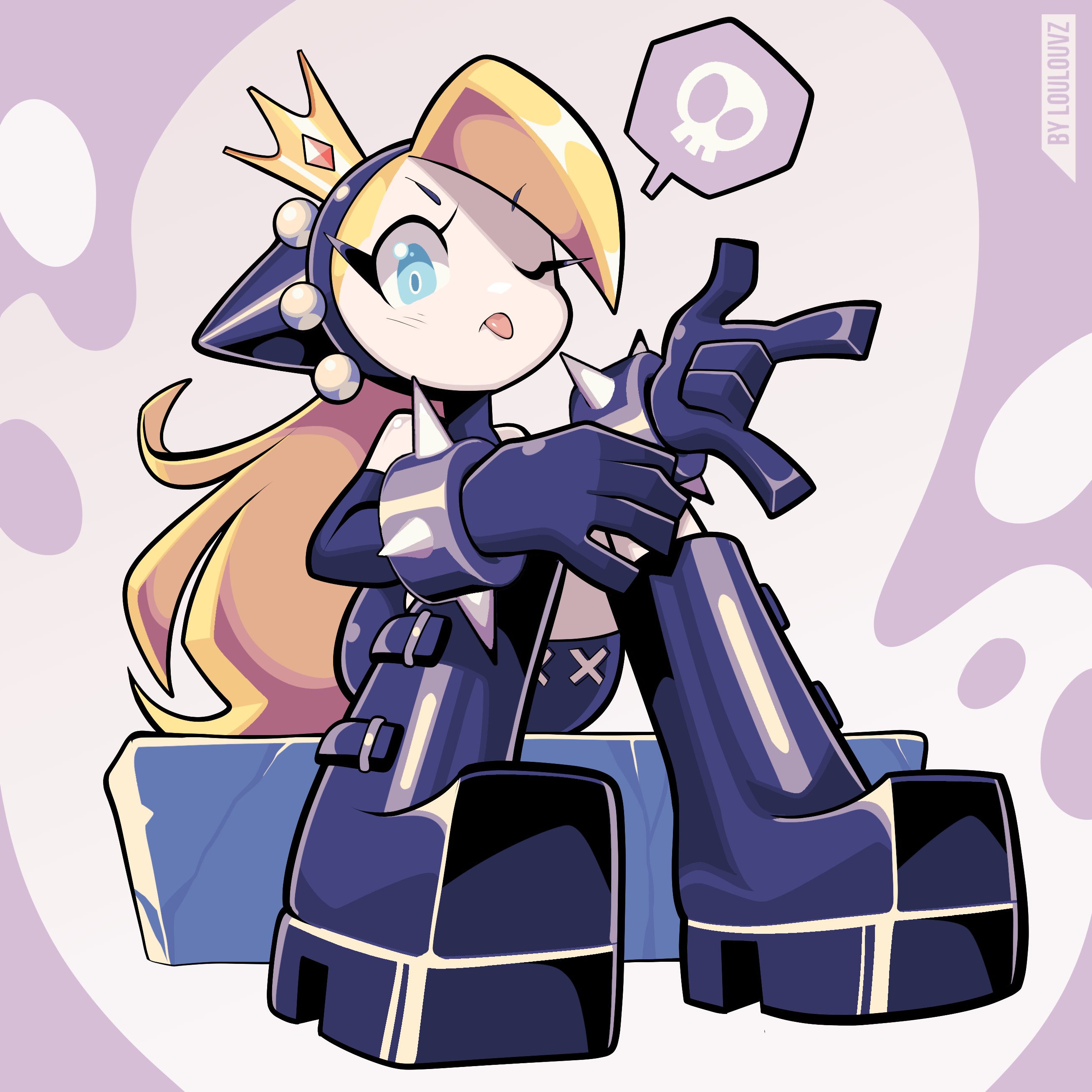 1girl absurdres animal_ears artist_name black_boots blonde_hair blue_eyes boots bracelet cat_ears crown dress elbow_gloves fake_animal_ears gloves highres hood hood_up hooded_dress jewelry leather leather_boots leather_dress long_eyelashes long_hair looking_at_viewer loulou_vz mario_(series) mario_power_tennis mario_tennis nintendo one_eye_closed pale_skin purple_background purple_dress sitting solo spiked_bracelet spikes spoken_skull taunting tongue tongue_out w warupeach