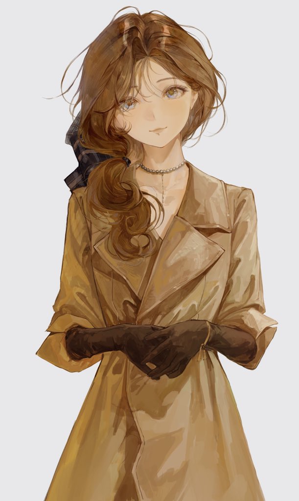 1girl black_gloves blue_eyes brown_coat brown_hair closed_mouth coat elbow_gloves giraffe_three gloves grey_background jewelry long_hair looking_at_viewer necklace original own_hands_together pearl_necklace ponytail sidelocks simple_background smile solo upper_body