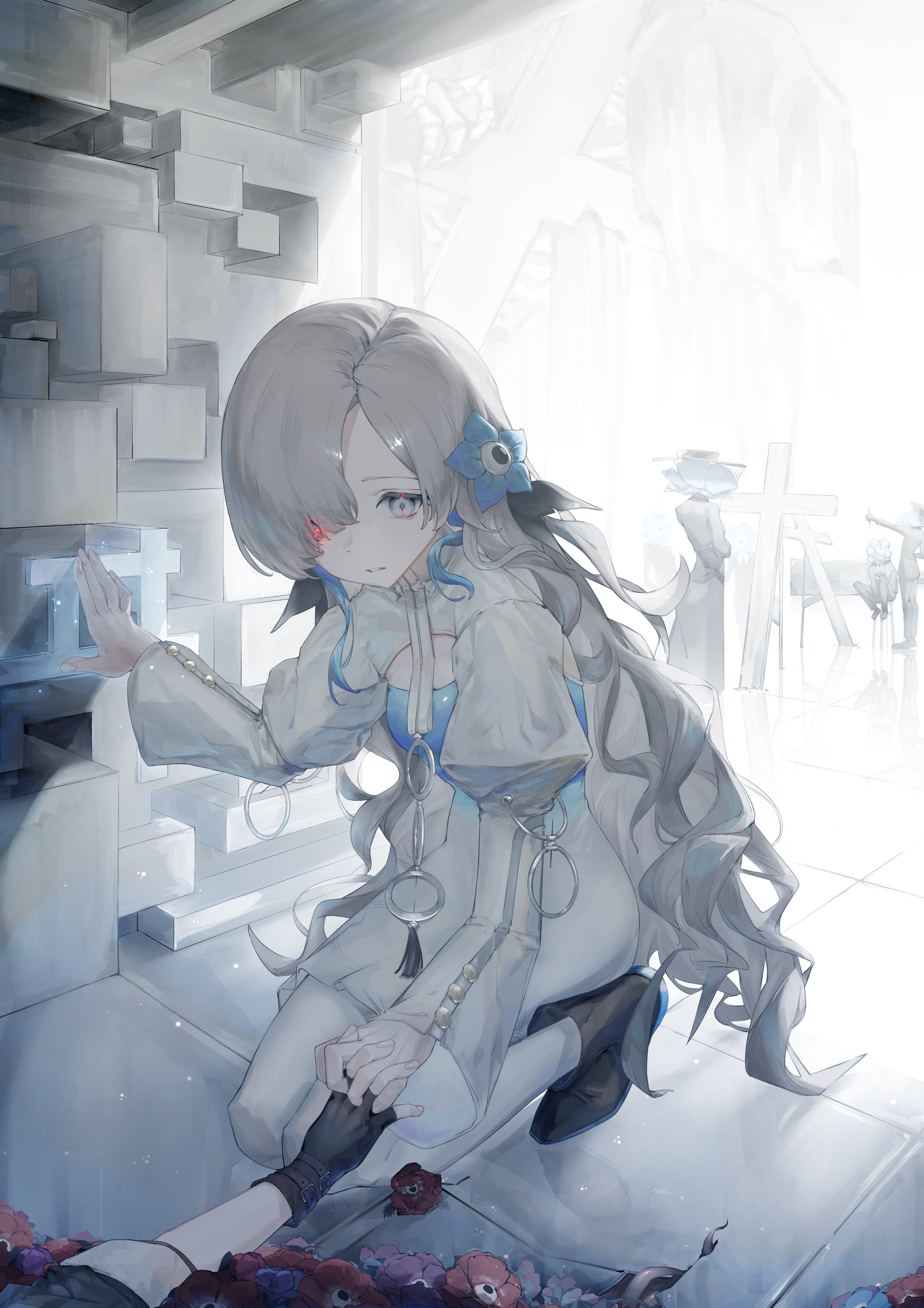 2girls 3others absurdres anemone_(flower) black_footwear black_gloves blue_dress blue_flower blue_hair boots commentary_request dress dual_persona fingerless_gloves flower gloves grey_eyes grey_hair hair_flower hair_ornament hair_over_one_eye heterochromia highres holding_hands interlocked_fingers isekaijoucho kamitsubaki_studio kneeling long_hair long_sleeves looking_down momori0118 multicolored_hair multiple_girls multiple_others pantyhose parted_lips red_eyes solo_focus two-tone_dress two-tone_hair underwear very_long_hair virtual_youtuber white_dress white_pantyhose