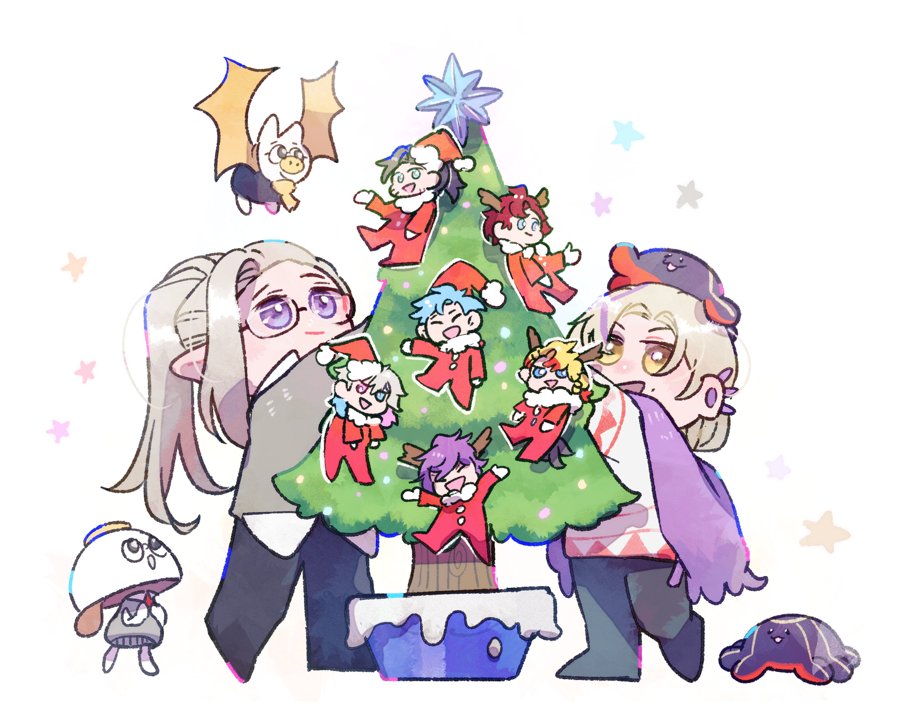 absurdres alternate_size animal animal_on_head antlers axel_syrios banzoin_hakka bat_(animal) beard_stubble black_hair blonde_hair blue_eyes blue_hair braid chibi christmas christmas_star christmas_tree closed_mouth cup decorating earrings facial_hair flying gavis_bettel glasses grey_hair grey_vest hanging_on_tree happy hat heterochromia highres holostars holostars_english holotempus horns jewelry josuiji_shinri licwiz1103 looking_at_viewer machina_x_flayon magmite_(magni_dezmond) magni_dezmond mole mole_under_mouth multicolored_hair multiple_boys multiple_legs noir_vesper on_head open_mouth pink_eyes pink_hair ponytail purple_eyes purple_hair red_hair regis_altare reindeer_antlers santa_costume santa_hat scarf shawl side_braid smile star_(symbol) streaked_hair stubble teacup vest vestea_(noir_vesper) vesties_(noir_vesper) virtual_youtuber waving white_background yellow_eyes