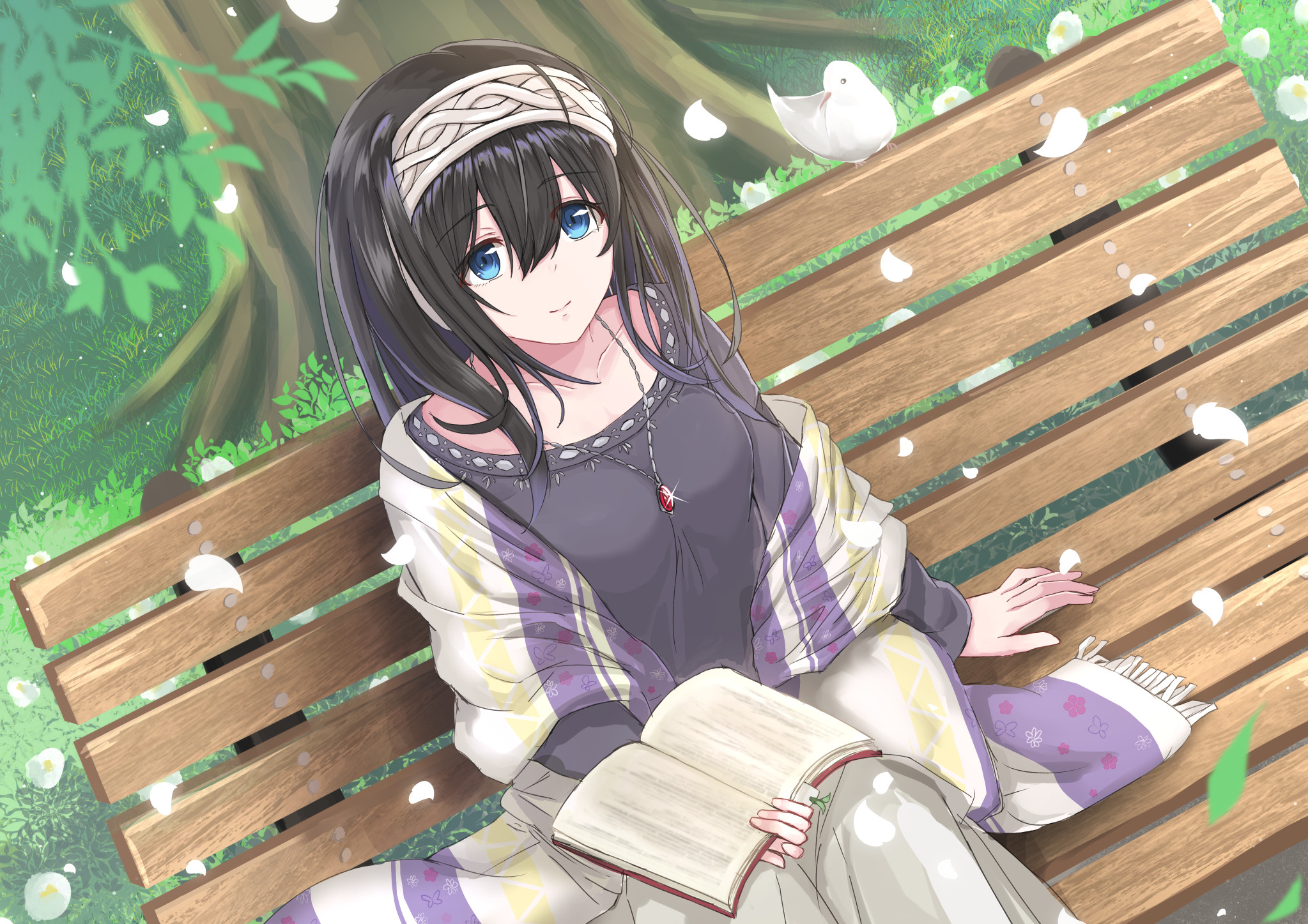 1girl bench bird black_hair black_shirt blue_eyes book breasts collarbone edelweiss_(wsparkz) falling_petals grass grey_skirt hair_between_eyes hairband highres holding holding_book idolmaster idolmaster_cinderella_girls light_smile looking_up medium_breasts multicolored_shawl on_bench outdoors park_bench petals sagisawa_fumika shawl shirt sitting skirt solo tree white_bird white_hairband