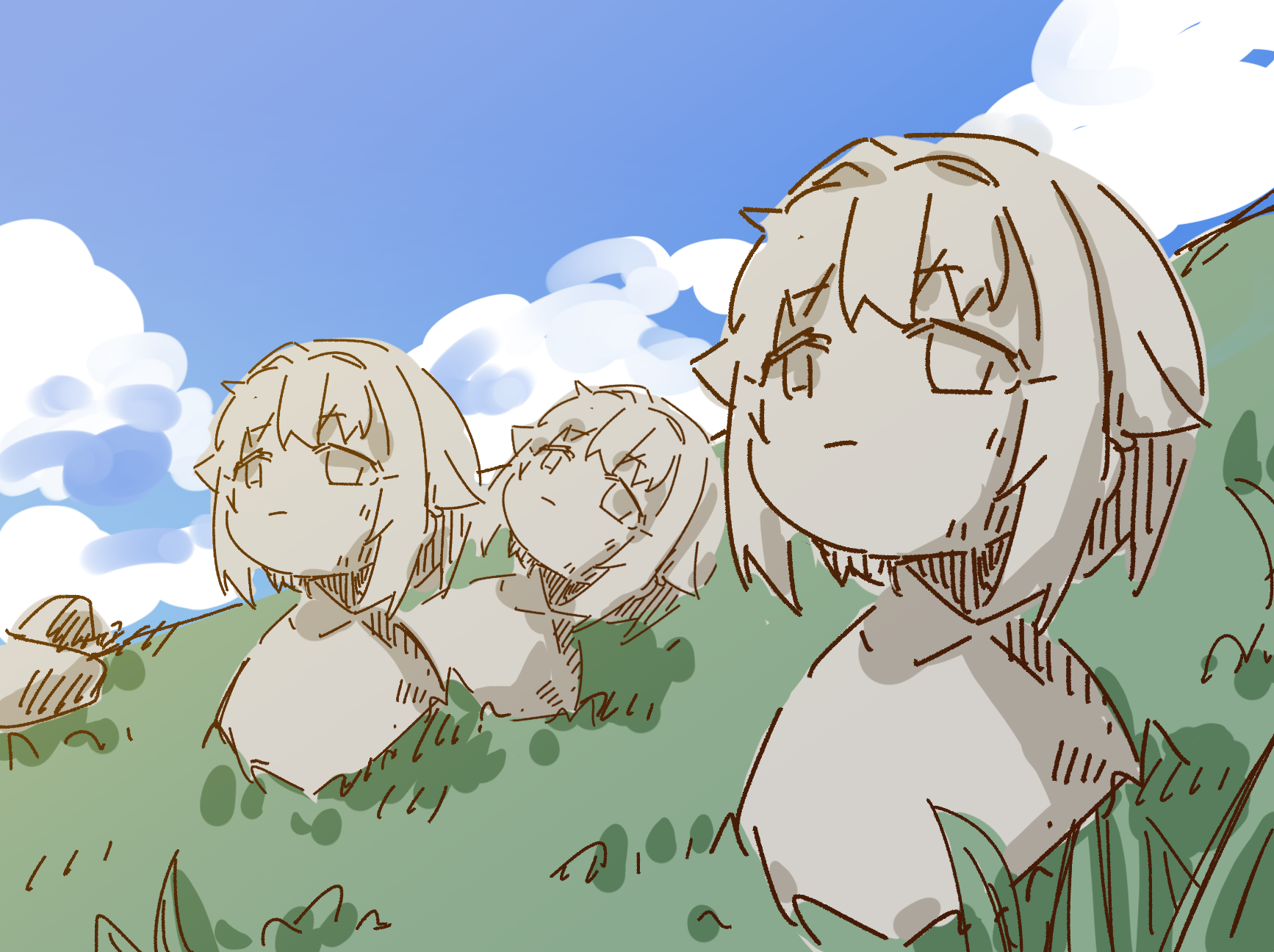 blue_sky closed_mouth cloud commentary_request day grass hair_flaps hair_intakes highres idolmaster idolmaster_cinderella_girls koshimizu_sachiko moai no_humans outdoors sky statue yukie_(kusaka_shi)