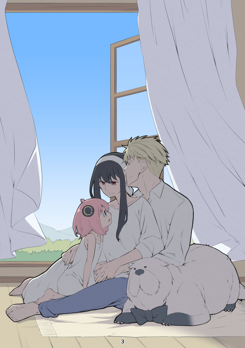 1boy 2girls adoptive_parent_and_adoptive_child anya_(spy_x_family) barefoot black_hair blonde_hair blue_pants bond_(spy_x_family) child closed_eyes commentary_request curtains dog dress family father_and_child father_and_daughter green_eyes hairband hairpods highres husband_and_wife kamimiya long_dress mother_and_child mother_and_daughter mountain multiple_girls open_window page_number pants parent_and_child pink_hair red_eyes rug shirt sidelocks sitting smile spy_x_family twilight_(spy_x_family) white_dog white_dress white_hairband white_shirt window yokozuwari yor_briar