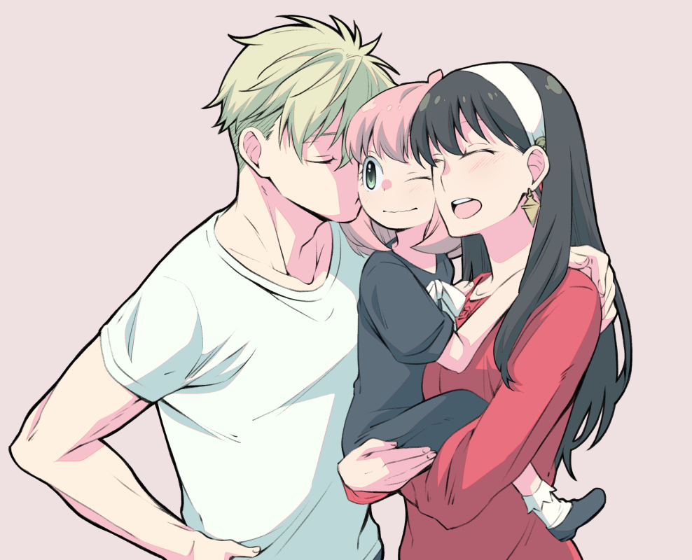 1boy 2girls adoptive_parent_and_adoptive_child anya_(spy_x_family) black_dress black_hair blonde_hair breasts carrying closed_eyes commentary_request dress earrings family father_and_child father_and_daughter gold_earrings green_eyes hair_down hairband hand_on_own_hip husband_and_wife jewelry kamimiya kiss kissing_cheek long_hair medium_breasts mother_and_child mother_and_daughter multiple_girls one_eye_closed open_mouth parent_and_child pink_hair shirt smile spy_x_family t-shirt twilight_(spy_x_family) white_hairband white_shirt yor_briar
