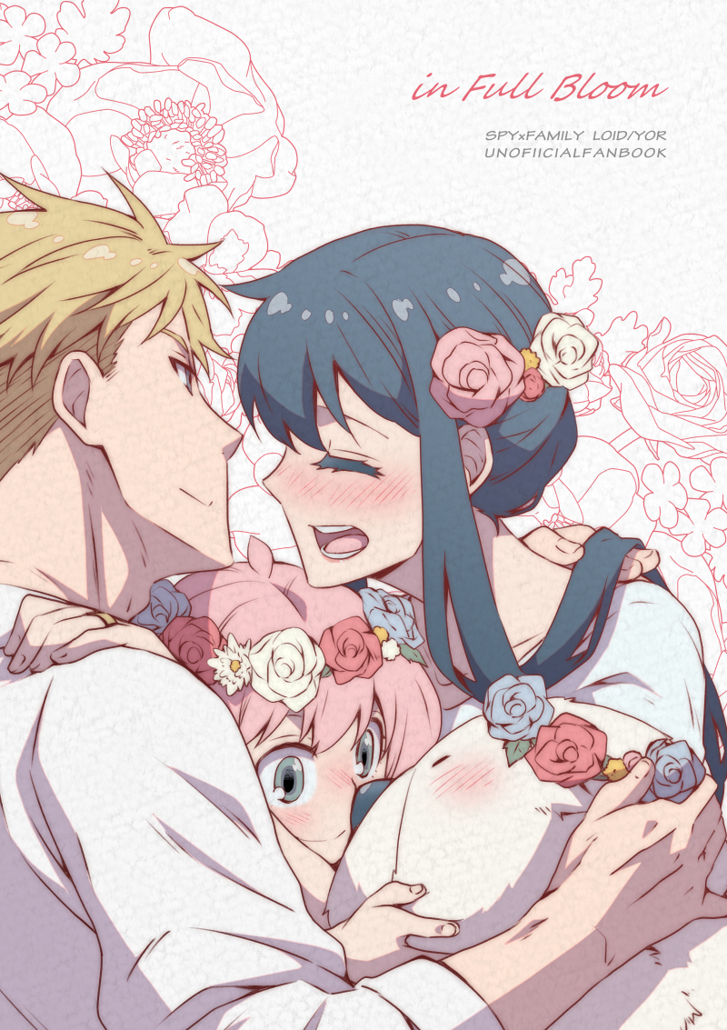 1boy 2girls adoptive_parent_and_adoptive_child anya_(spy_x_family) black_hair blonde_hair blue_flower blue_rose bond_(spy_x_family) commentary_request cover cover_page dog family father_and_child father_and_daughter floral_background flower grey_eyes group_hug hair_flower hair_ornament head_wreath hug husband_and_wife kamimiya long_hair mother_and_child mother_and_daughter multiple_girls parent_and_child pink_hair red_flower red_rose rose sidelocks spy_x_family twilight_(spy_x_family) white_flower white_rose yor_briar