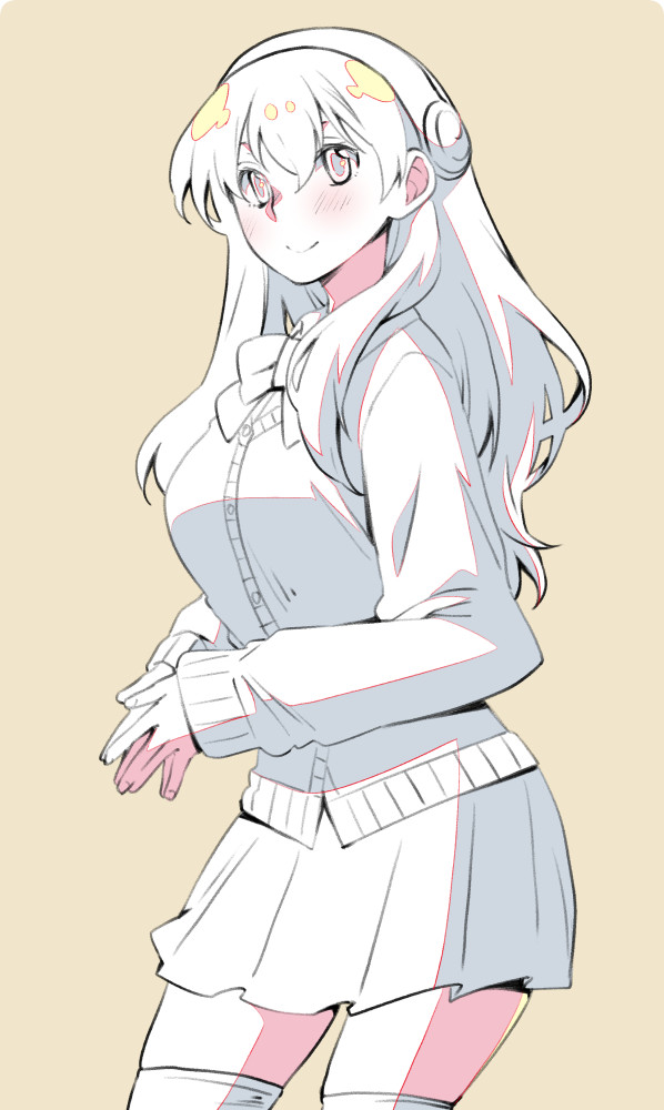 1girl breasts brown_background cardigan commentary_request dr._stone eyebrows_hidden_by_hair hairband kamimiya large_breasts limited_palette long_sleeves miniskirt ogawa_yuzuriha own_hands_together pleated_skirt sketch skirt sleeves_past_wrists smile solo thighhighs zettai_ryouiki