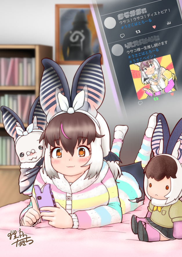 1girl animal_ears bat_ears bat_girl bat_wings bed brown_eyes brown_hair brown_long-eared_bat_(kemono_friends) cellphone extra_ears glasses grey_hair japari_symbol kemono_friends kemono_friends_v_project long_hair mujinamori_tamakichi pajamas phone poporu_(kemono_friends) smartphone stuffed_toy virtual_youtuber wings